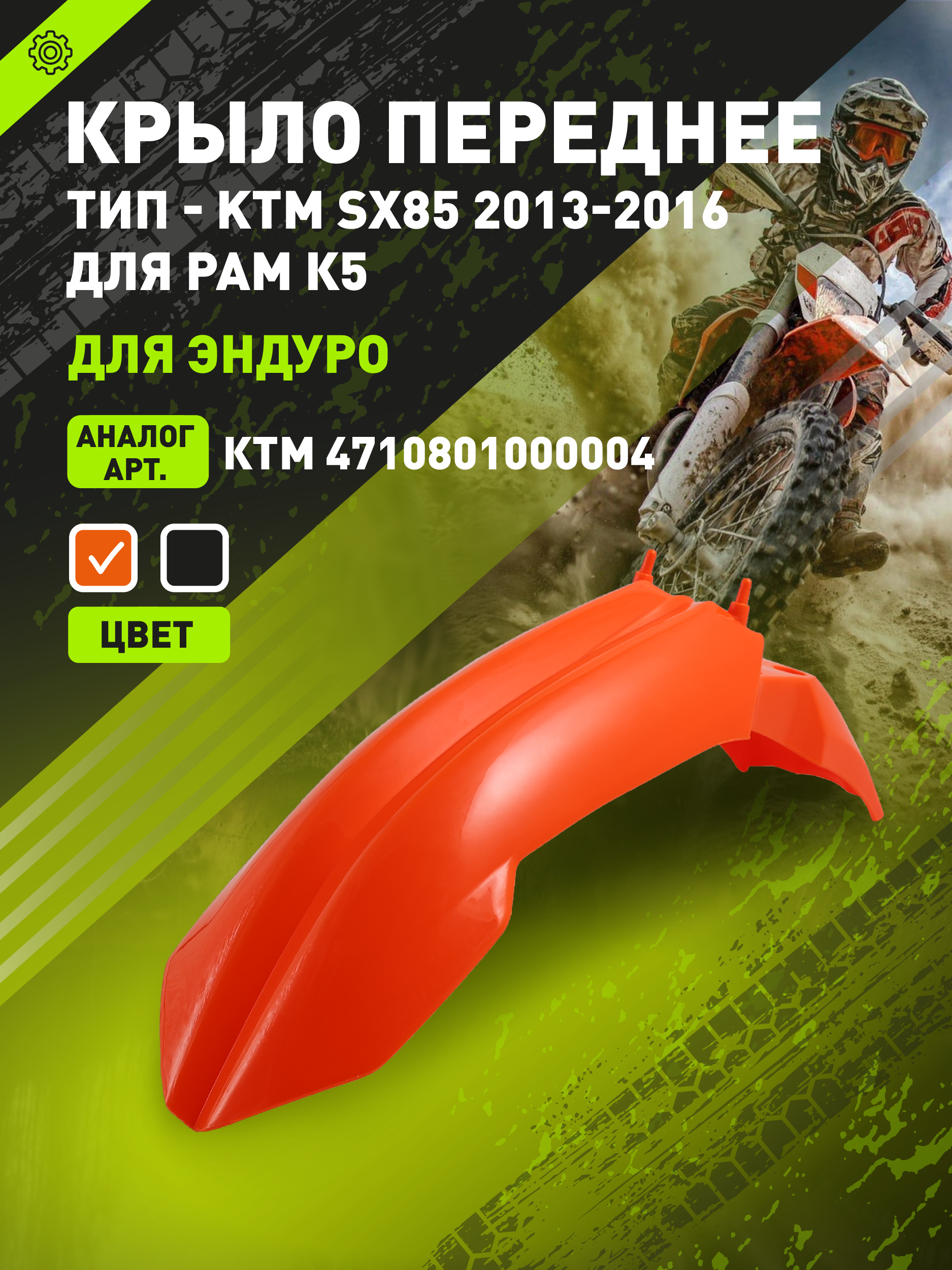 - Оранжевое переднее крыло для мотоциклов KTM SX85 2013-2016 года, а также аналогичных китайских моделей на раме K5. Деталь изготовлена из высококачественного ударопрочного пластика по типу KTM SX85 и подходит для интенсивной эксплуатации в условиях эндуро. Полный аналог оригинального крыла KTM с артикулом 4710801000004. Крыло придаёт мотоциклу фирменный стиль KTM и обеспечивает надёжную защиту передней части от грязи и камней. Простая установка на штатные места без доработок.