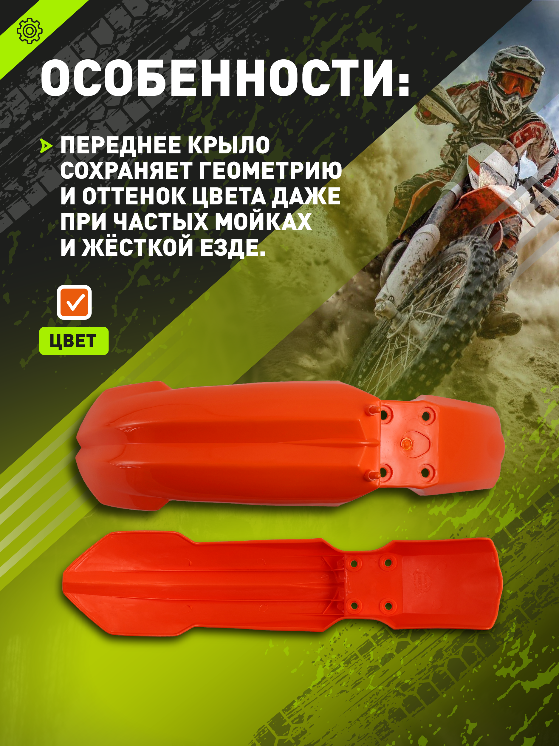 - • Материал: высококачественный ударопрочный пластик (тип KTM SX85)