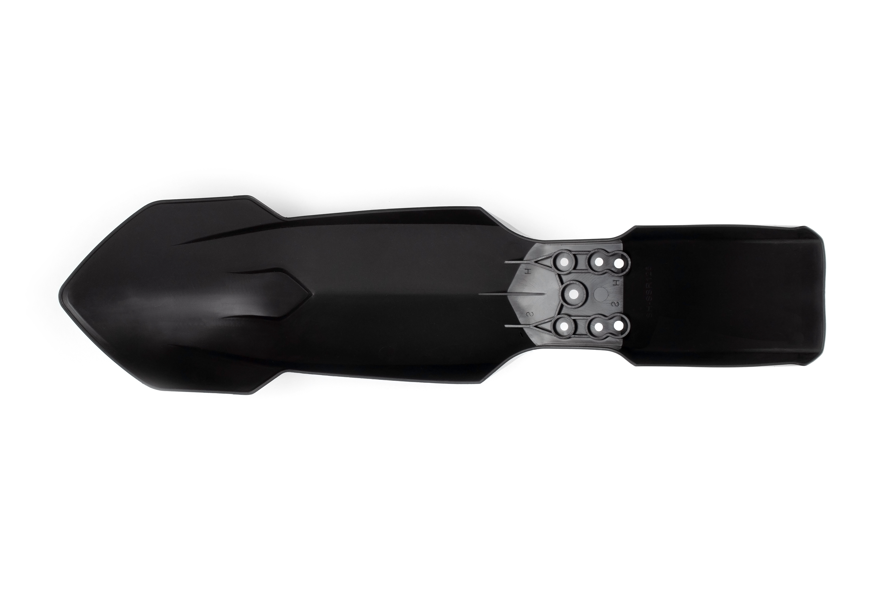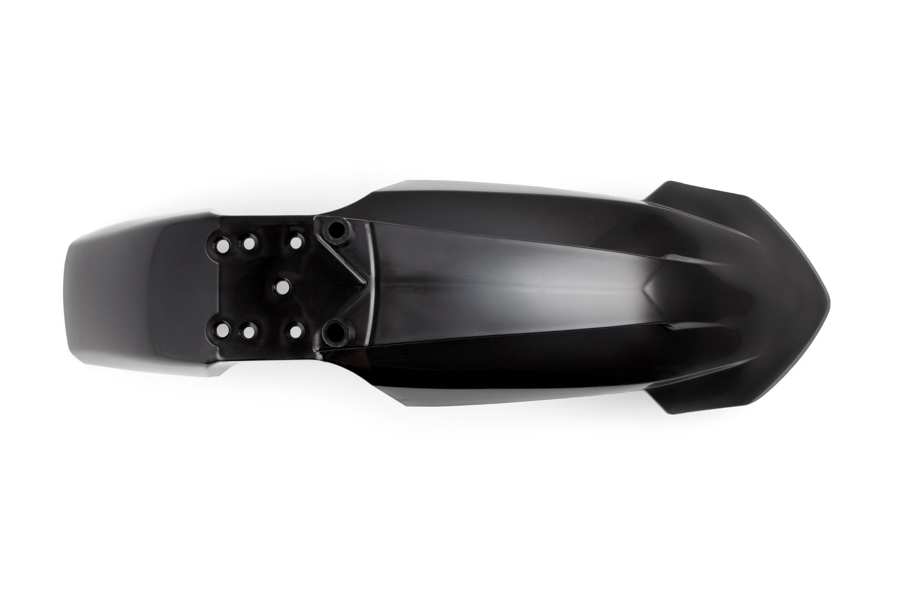 Площадка крепления к нижней траверсе (4 отверстия) обеспечивает надежную фиксацию. Кроме того, наличие двух специальных направляющих выступов (пинов) в верхней части гарантирует правильную и плотную стыковку крыла с кроссовым щитком (номерной панелью) или маской фары в стиле KTM.