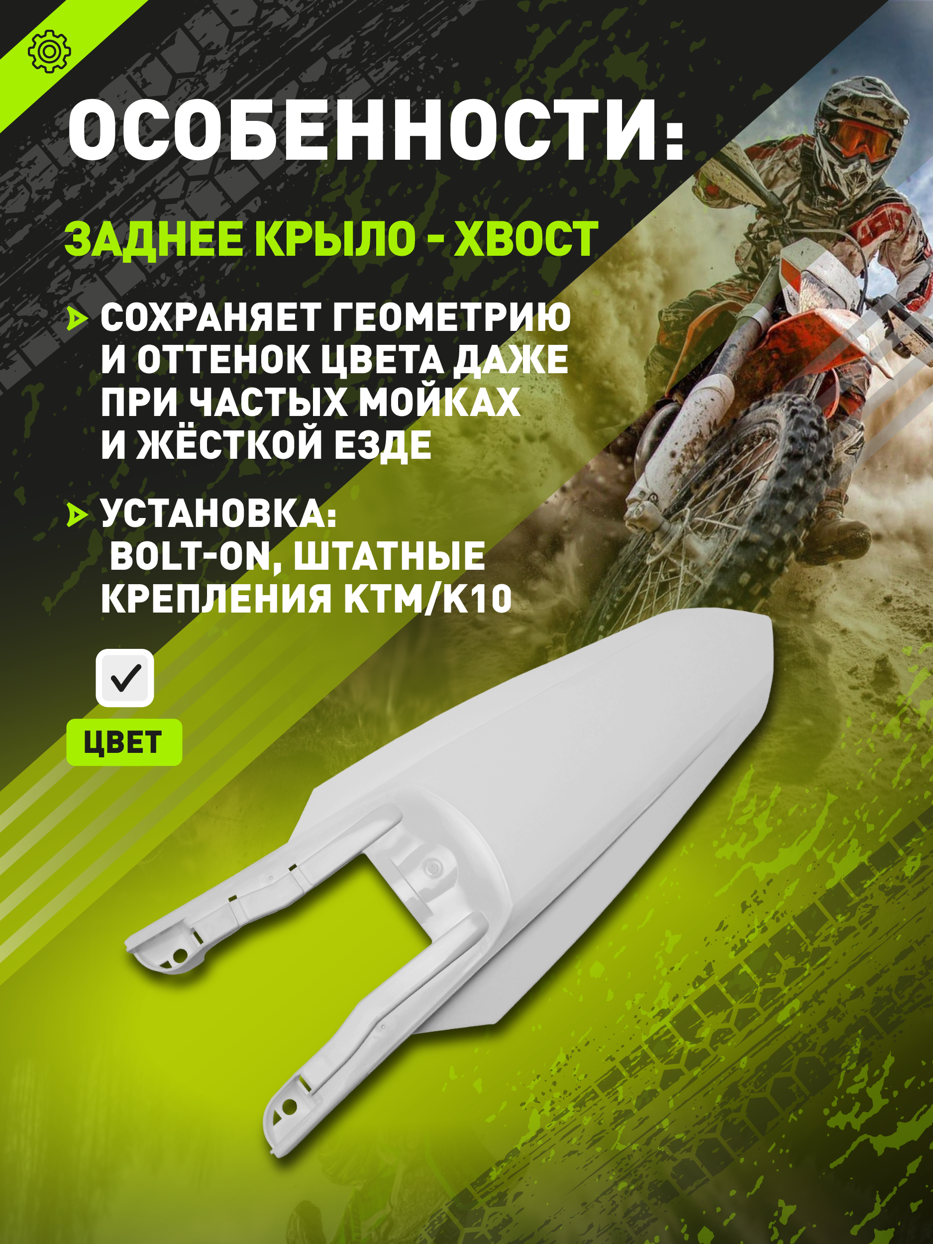 - Белое заднее крыло для эндуро мотоциклов KTM 2024 года, а также для аналогичных китайских моделей на раме K10 (KEWS, AJ1, BRZ и др). Изготовлено из прочного и эластичного пластика, соответствующего типу KTM 24г. Полный аналог оригинальной детали KTM с артикулом A46008013000EBC. Надежно защищает заднюю часть от грязи и повреждений, легко устанавливается на штатные крепления без доработок и придает байку свежий внешний вид.