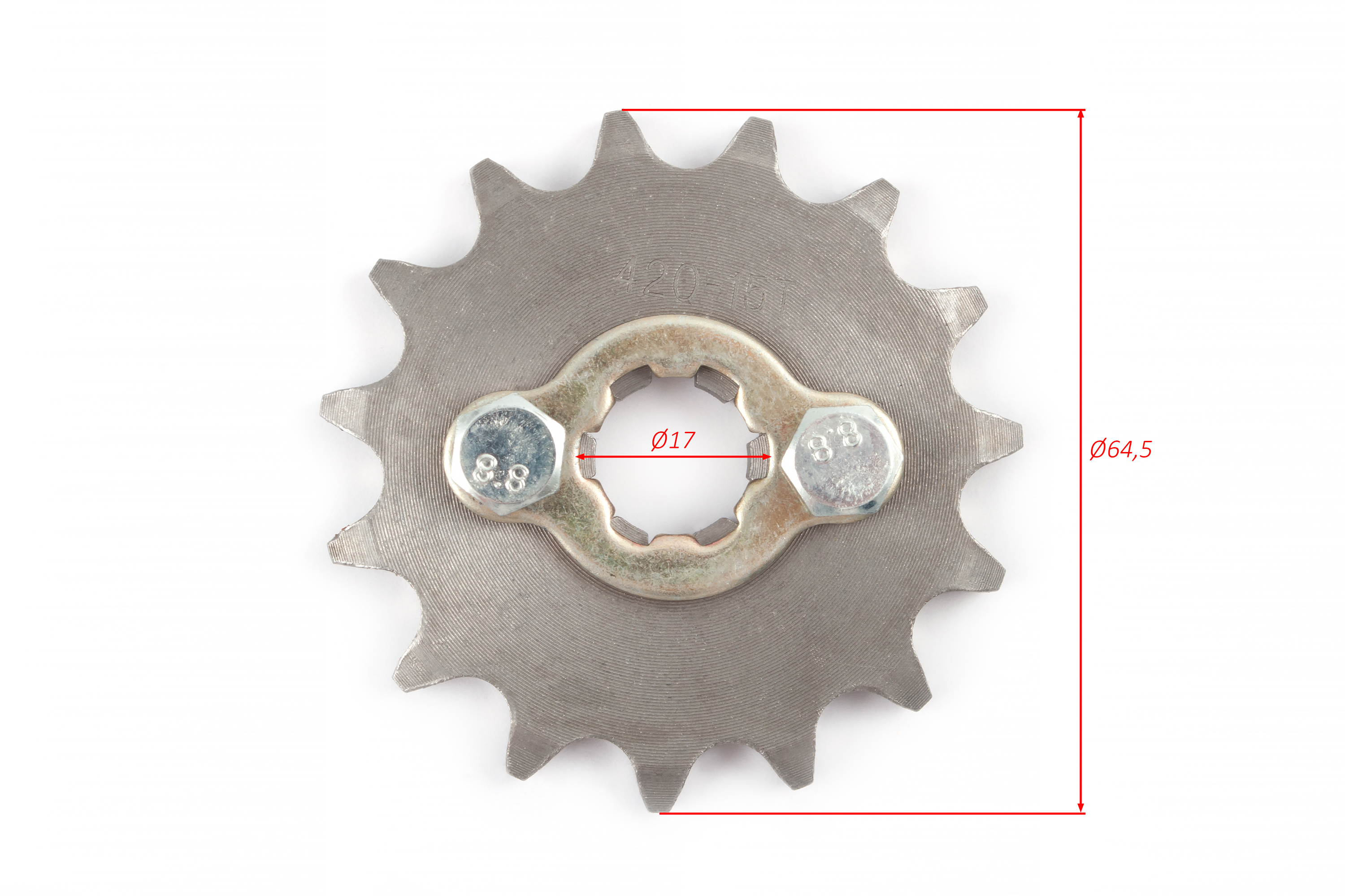 - Ведущая звезда с шагом цепи 420, 15 зубьями и посадочным отверстием 17 мм для питбайков. Изготовлена из прочной стали, обеспечивает надежное зацепление с цепью и эффективную передачу мощности. Прямая установка на выходной вал двигателя.