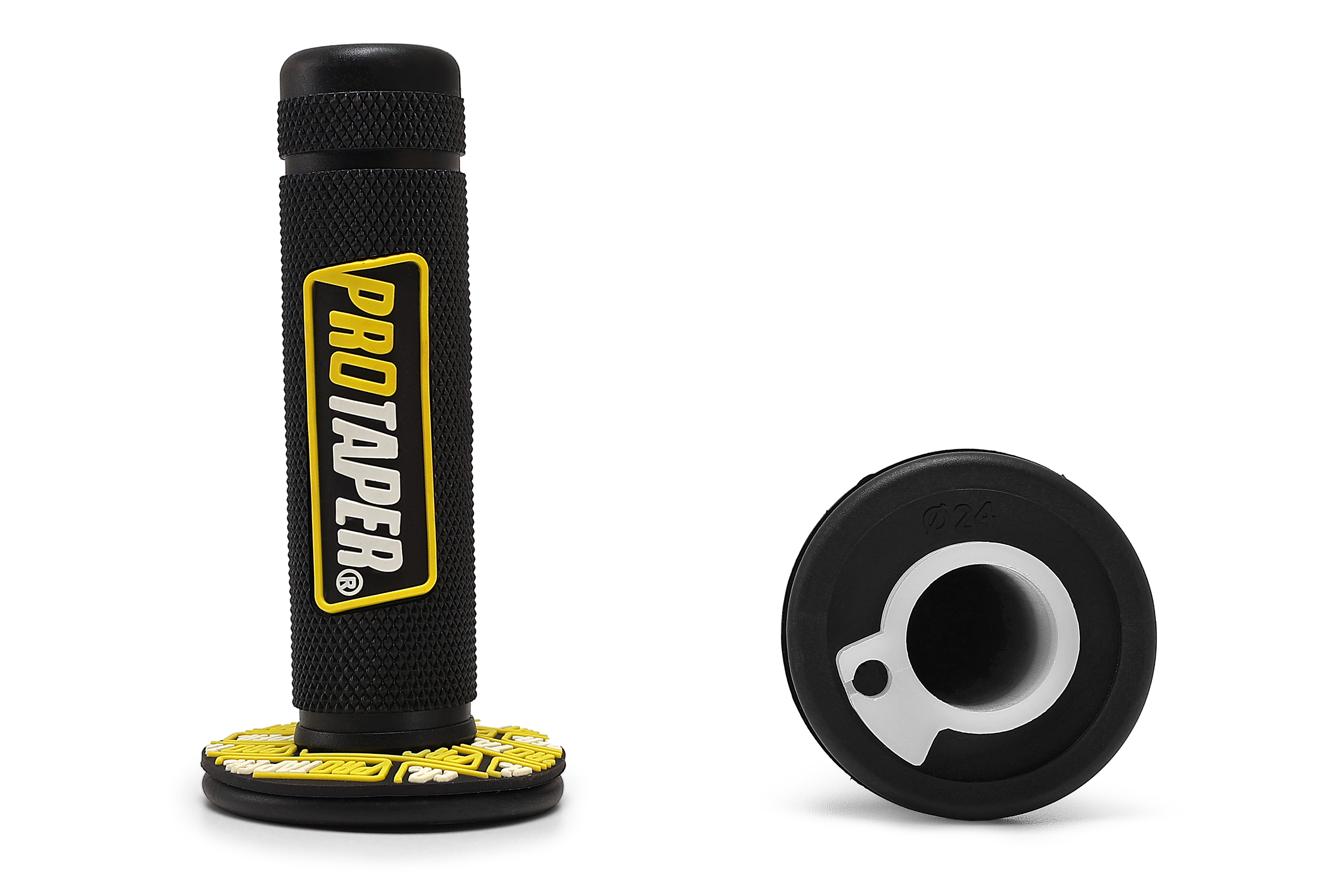 - Комплект резиновых грипс Pro-Taper с пластиковой основой ручки газа для мопедов, питбайков, скутеров и эндуро мотоциклов. Левая грипса диаметром 22 мм устанавливается непосредственно на руль, правая грипса диаметром 22 мм интегрирована с пластиковой основой ручки газа стандартного размера.