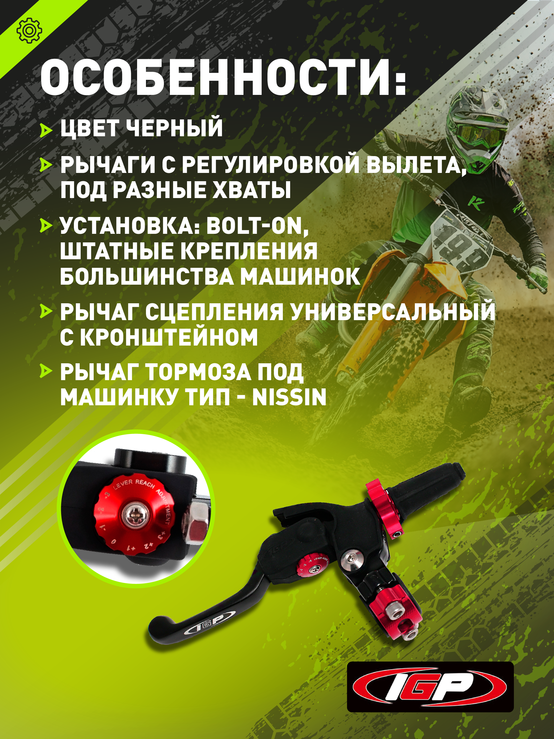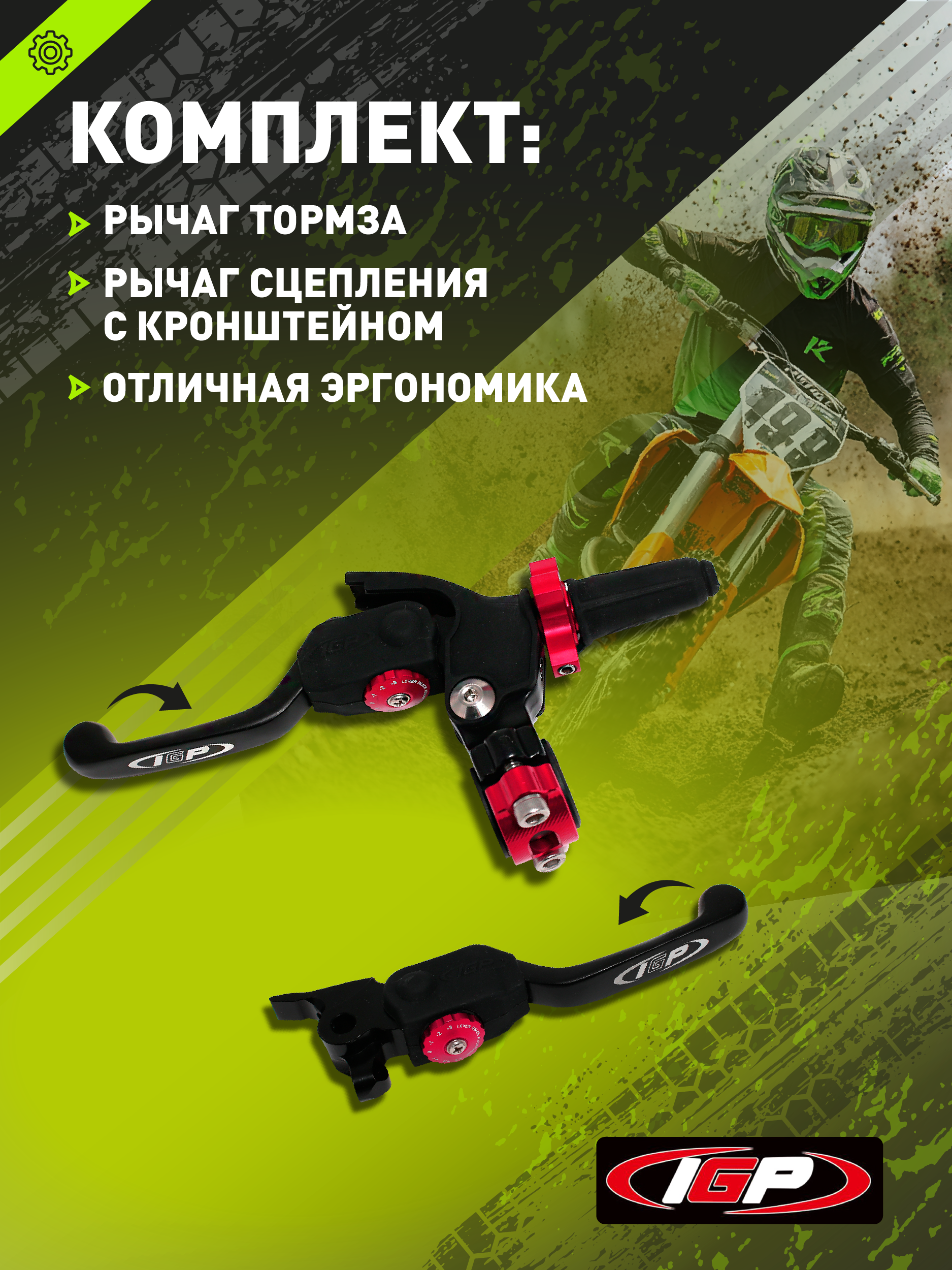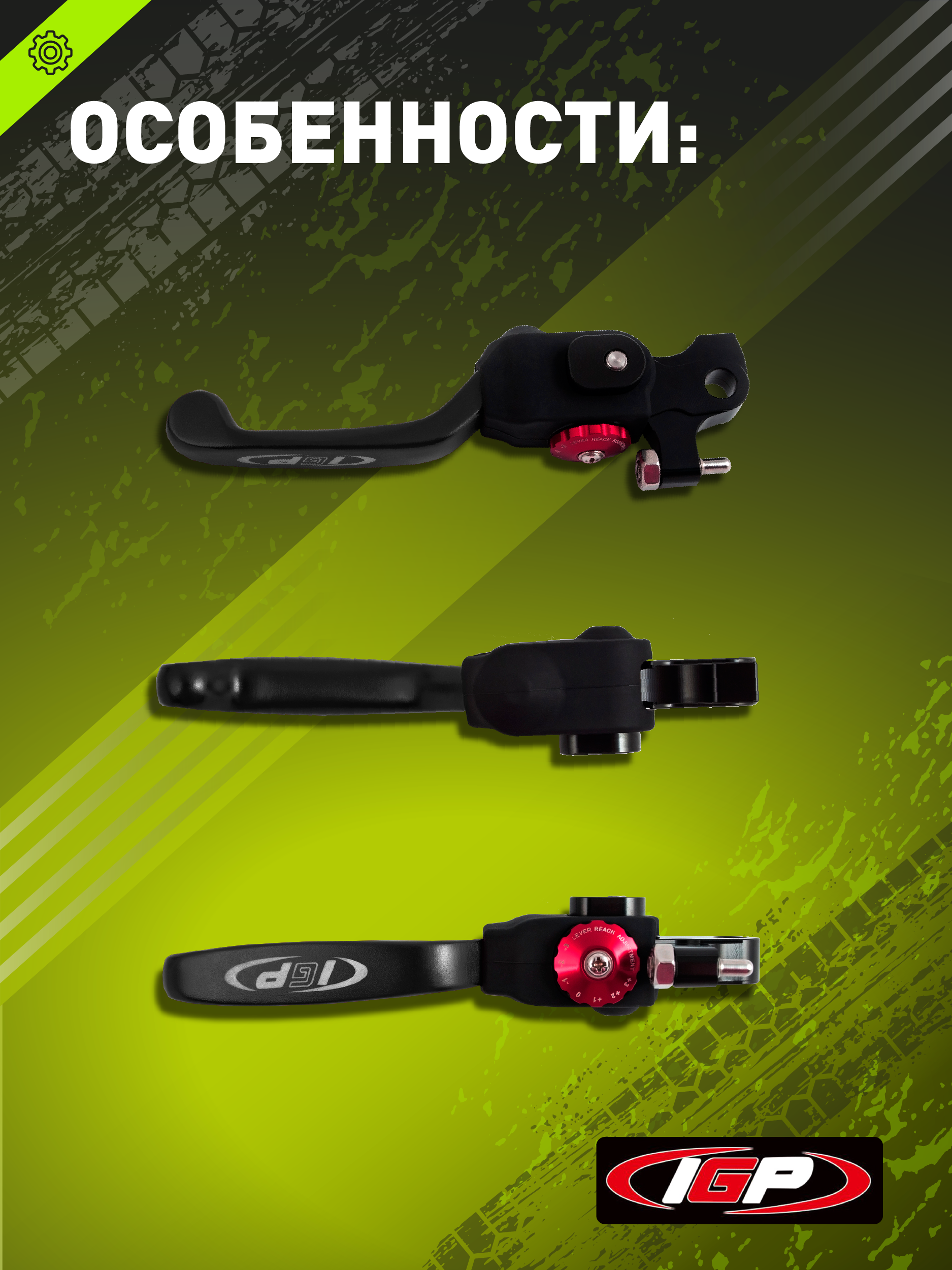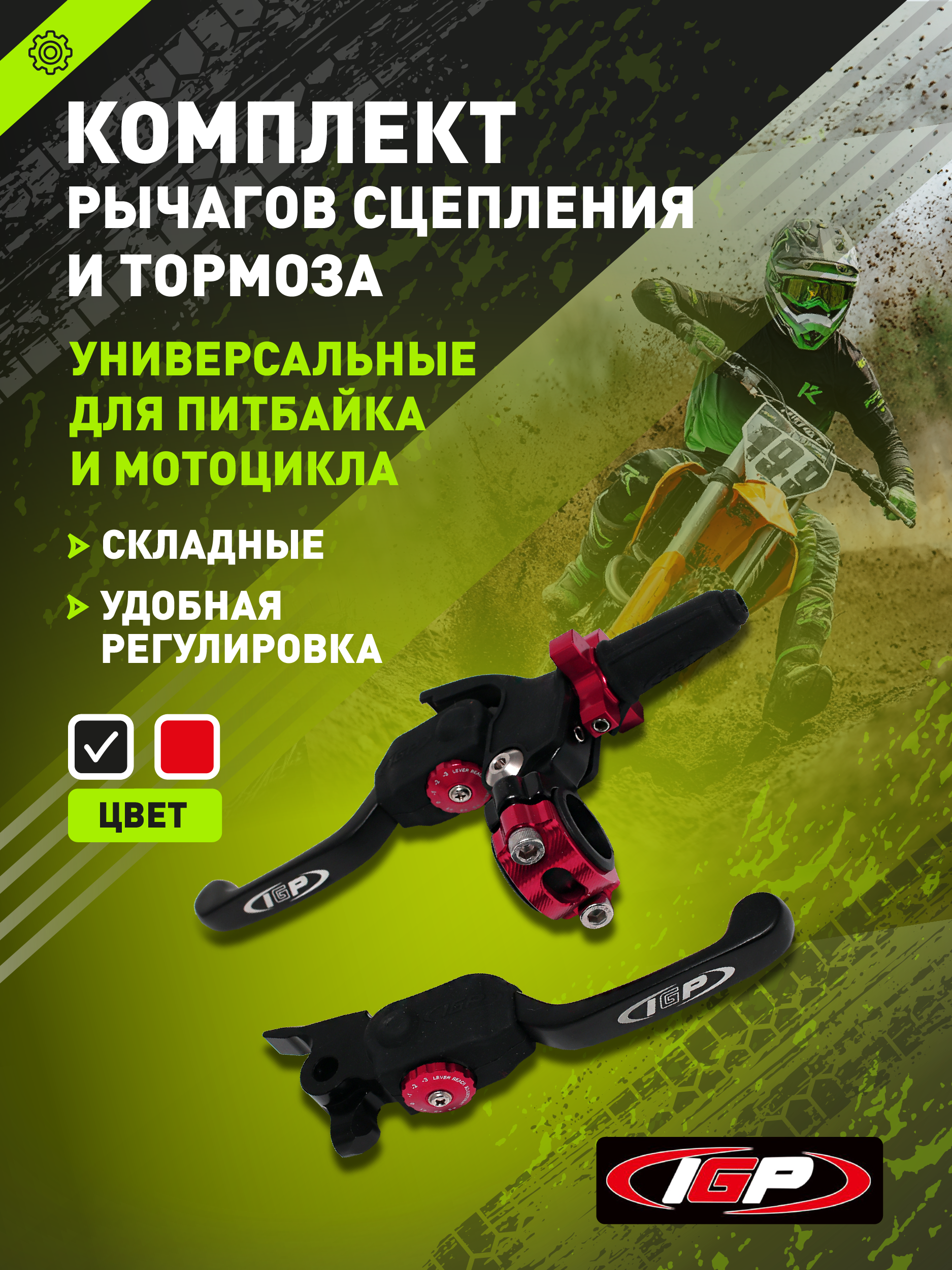 Профессиональный комплект складных рычагов сцепления и тормоза IGP360 в черном цвете, выполнен из высококачественного алюминия методом CNC-обработки. Обеспечивает отличный контроль и надежность в любых условиях. Рычаг сцепления — универсальный, подходит для большинства питбайков, мотокроссовых и эндуро-мотоциклов. Тормозной рычаг предназначен для установки на тормозные машинки Brembo, которые используются на мотоциклах KTM и их аналогах.