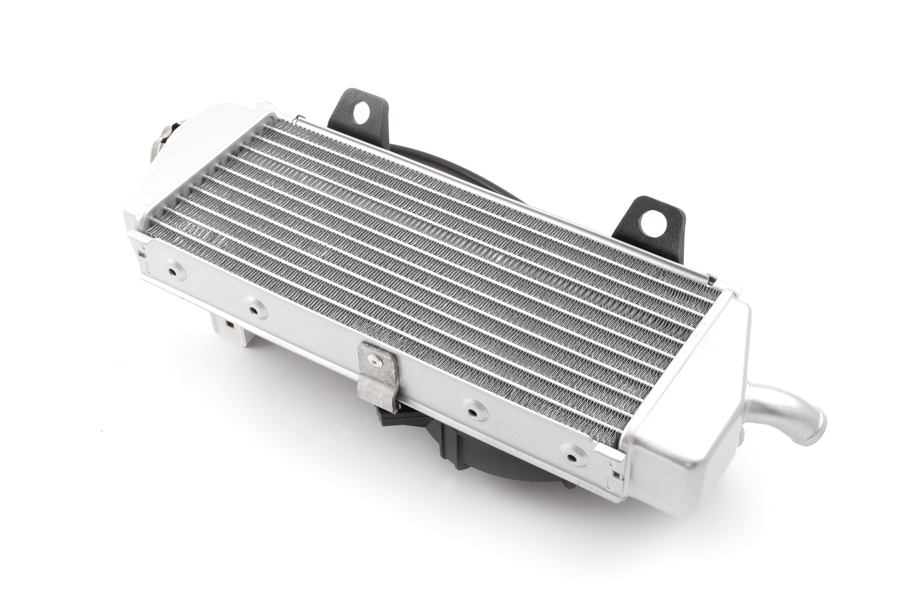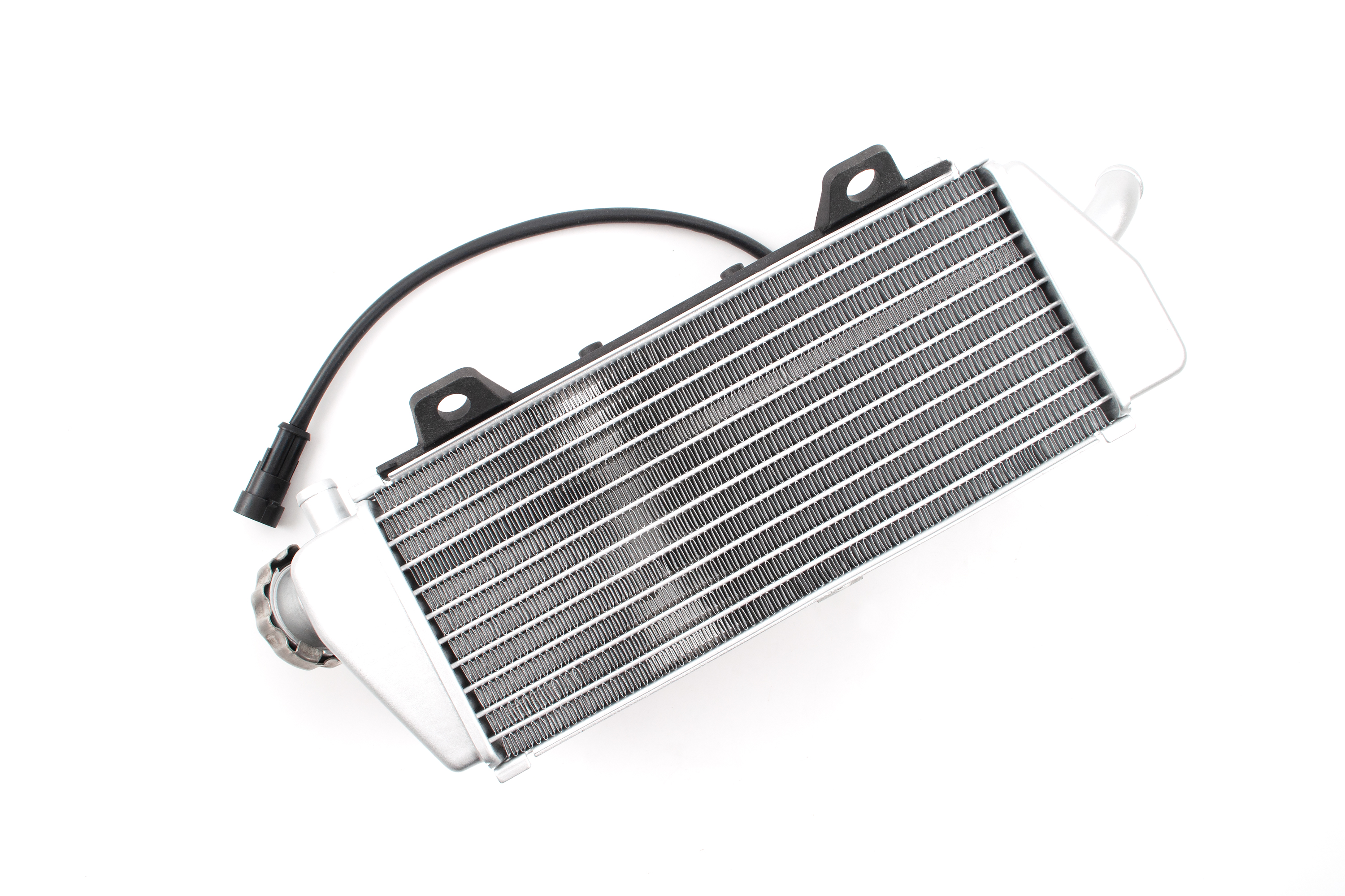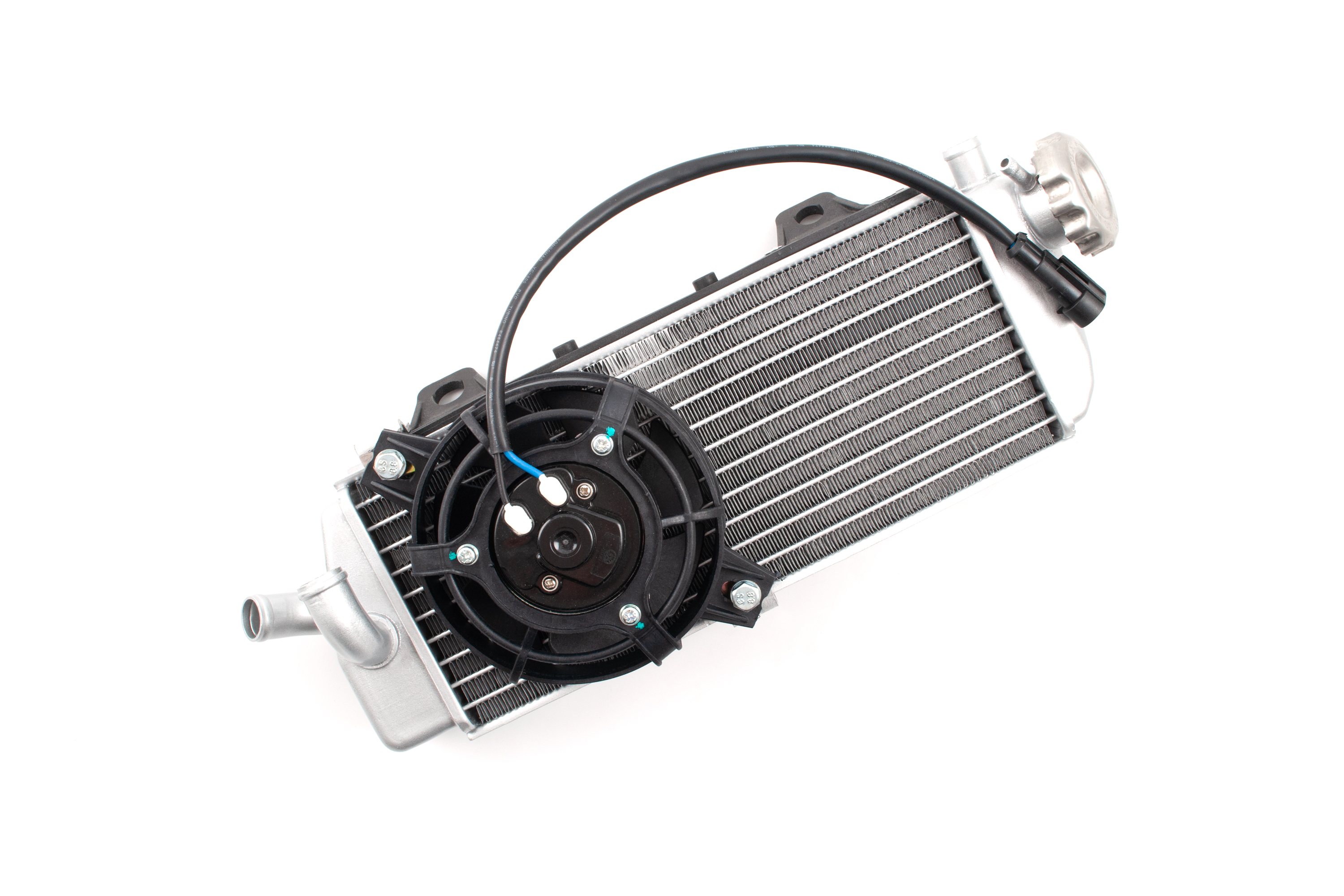 уже в сборе с мощным охлаждающим вентилятором! Это полностью готовое решение (Bolt-on) для замены поврежденного узла. Радиатор имеет точную заводскую геометрию, рассчитанную специально под современную раму K10 и облицовочный пластик стандарта KTM 2023 года и новее.