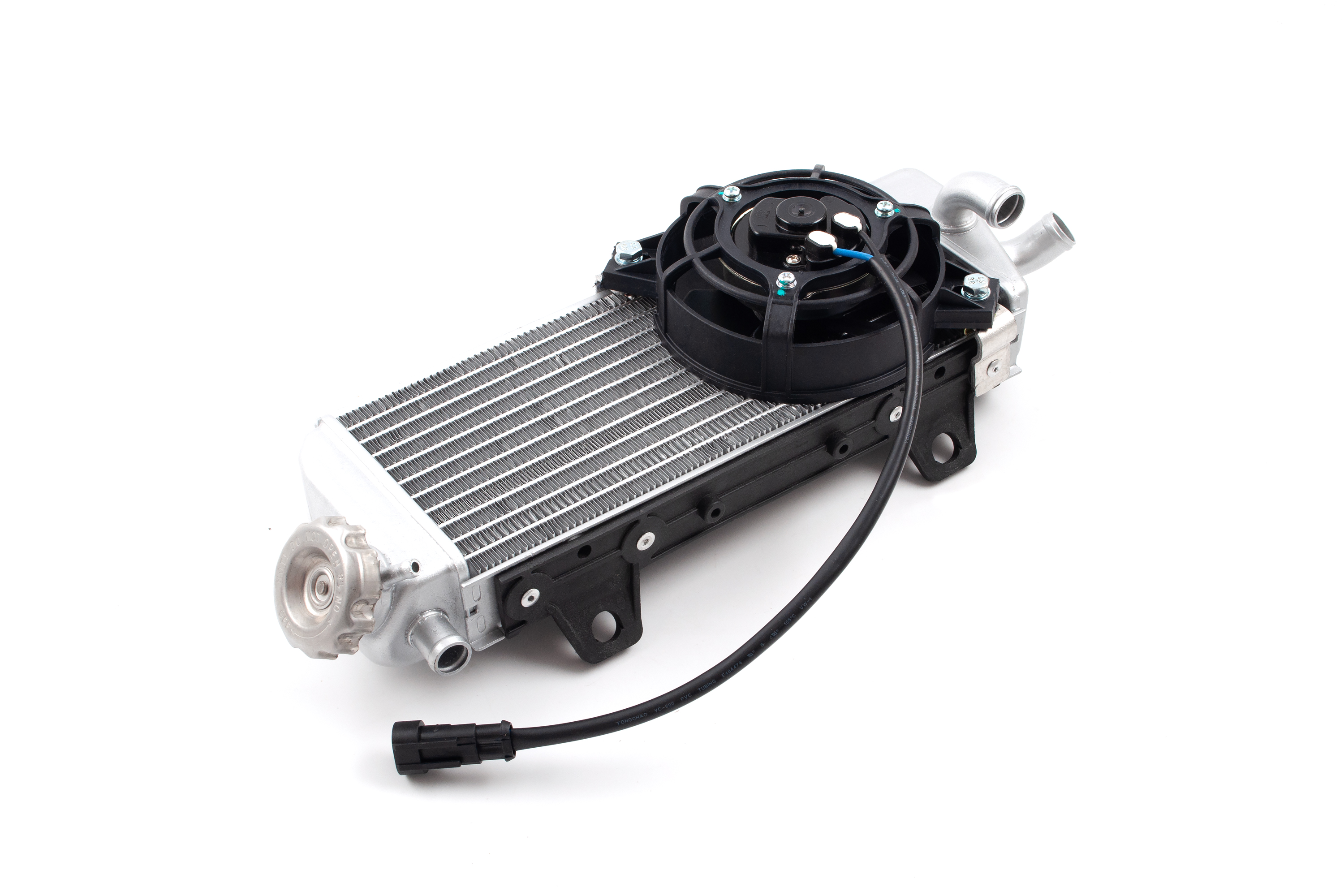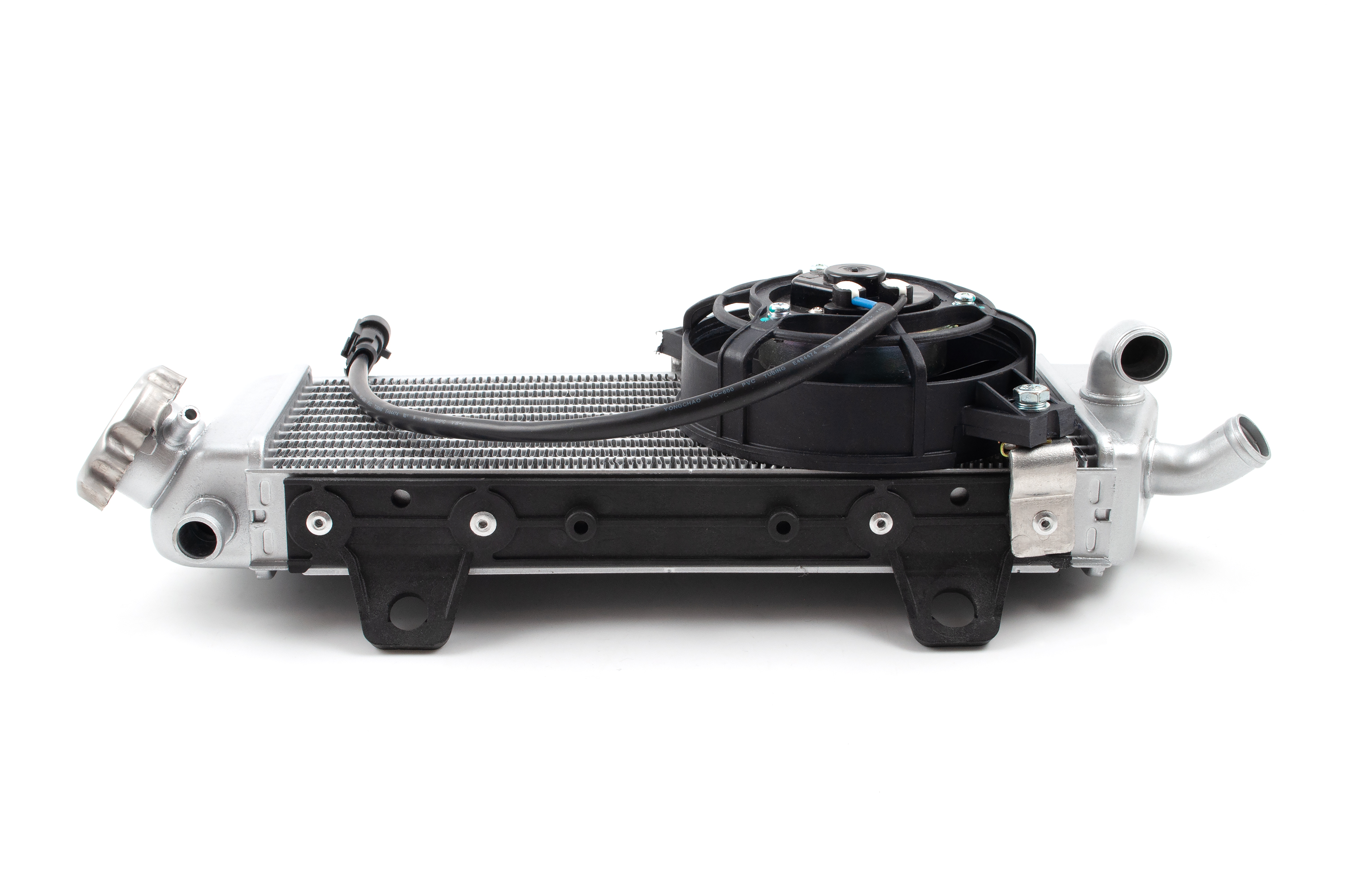 - • Комплектация (Full Kit): Алюминиевый правый радиатор + установленный электровентилятор (12V) с защитной решеткой и кабелем подключения + крышка радиатора с клапаном давления.