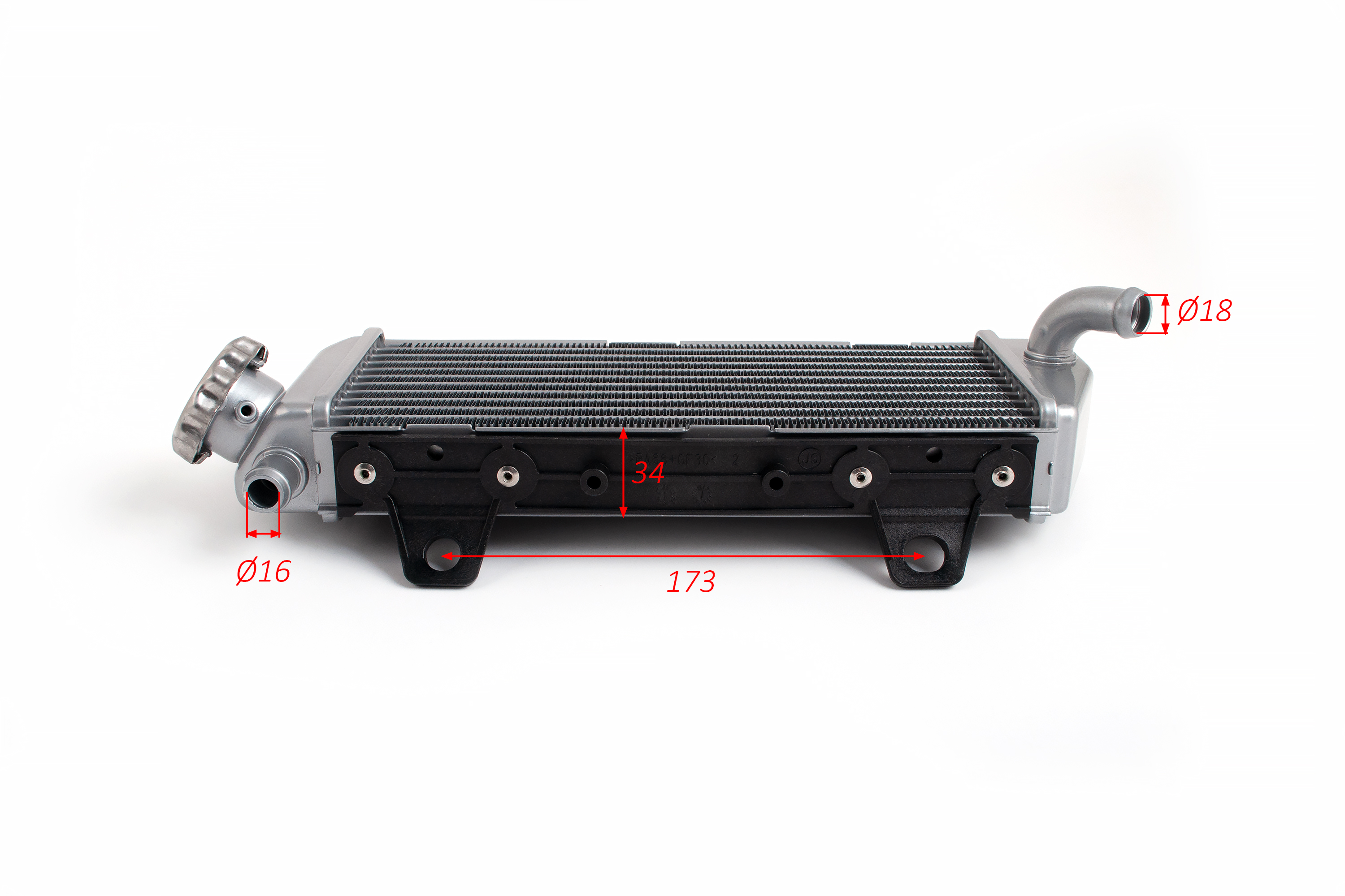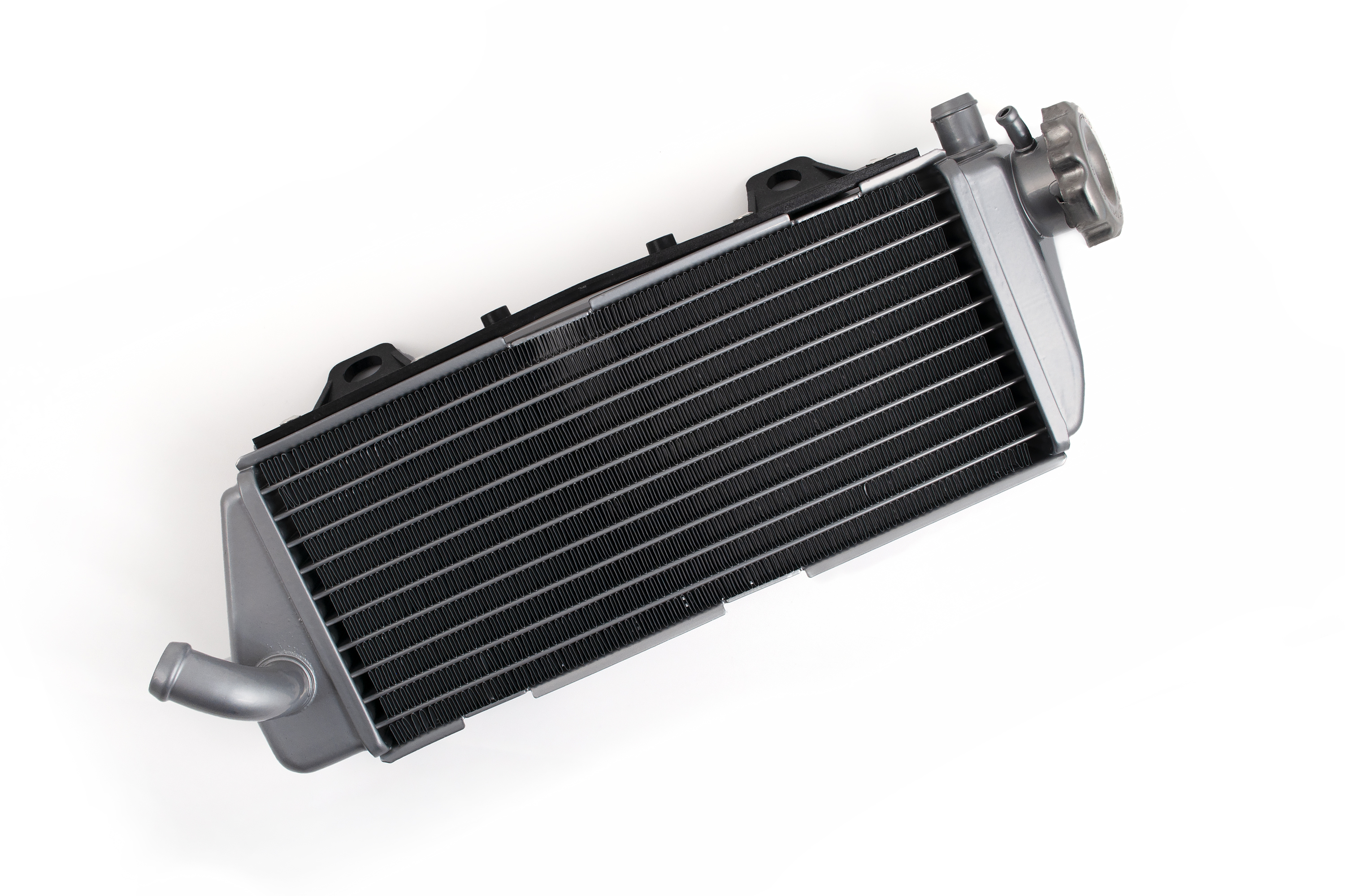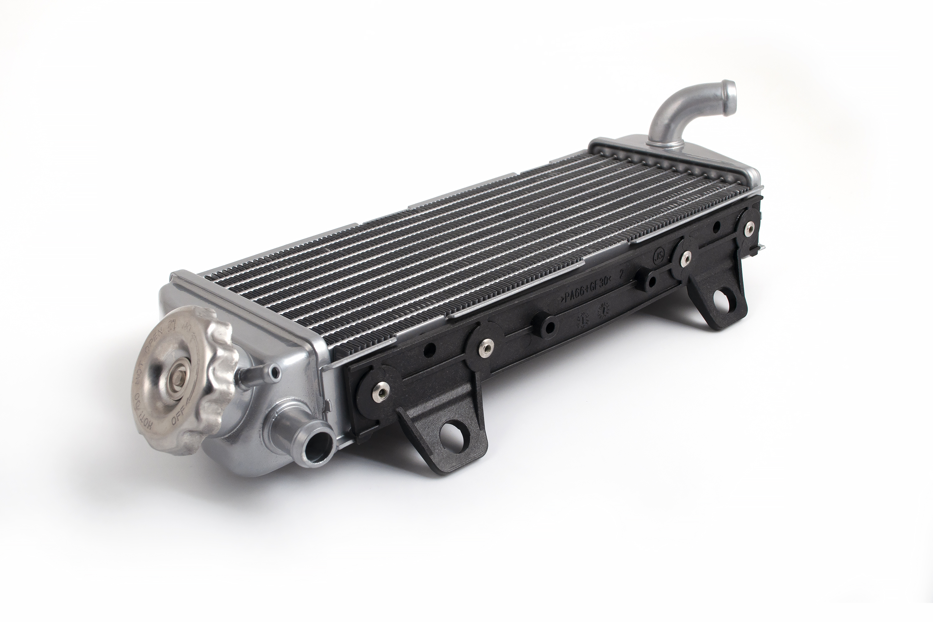 Правый радиатор поставляется в сборе с металлической крышкой (пробкой) заливной горловины, оборудованной клапаном сброса давления. Деталь полностью готова к подключению патрубков и заливке антифриза.