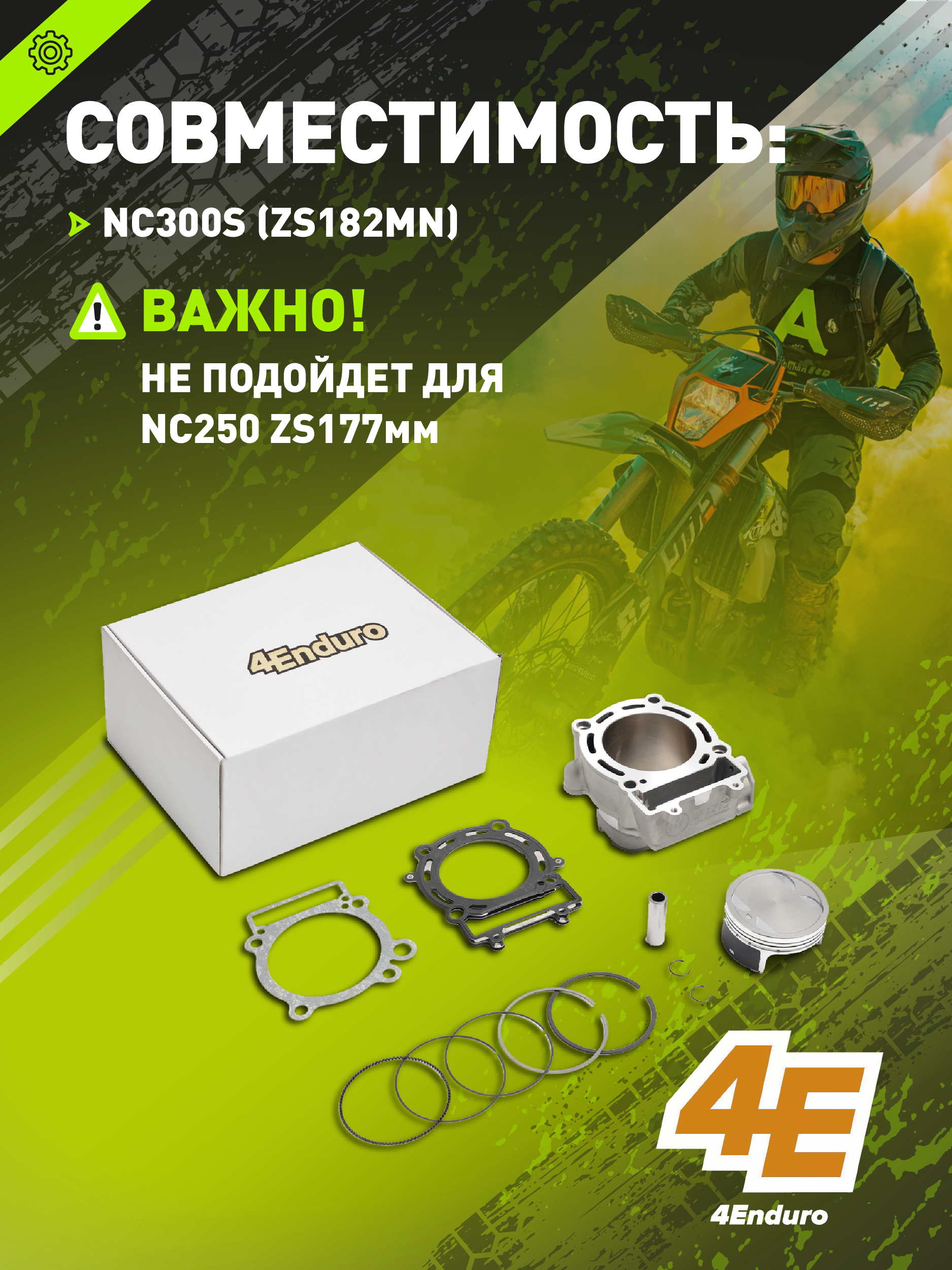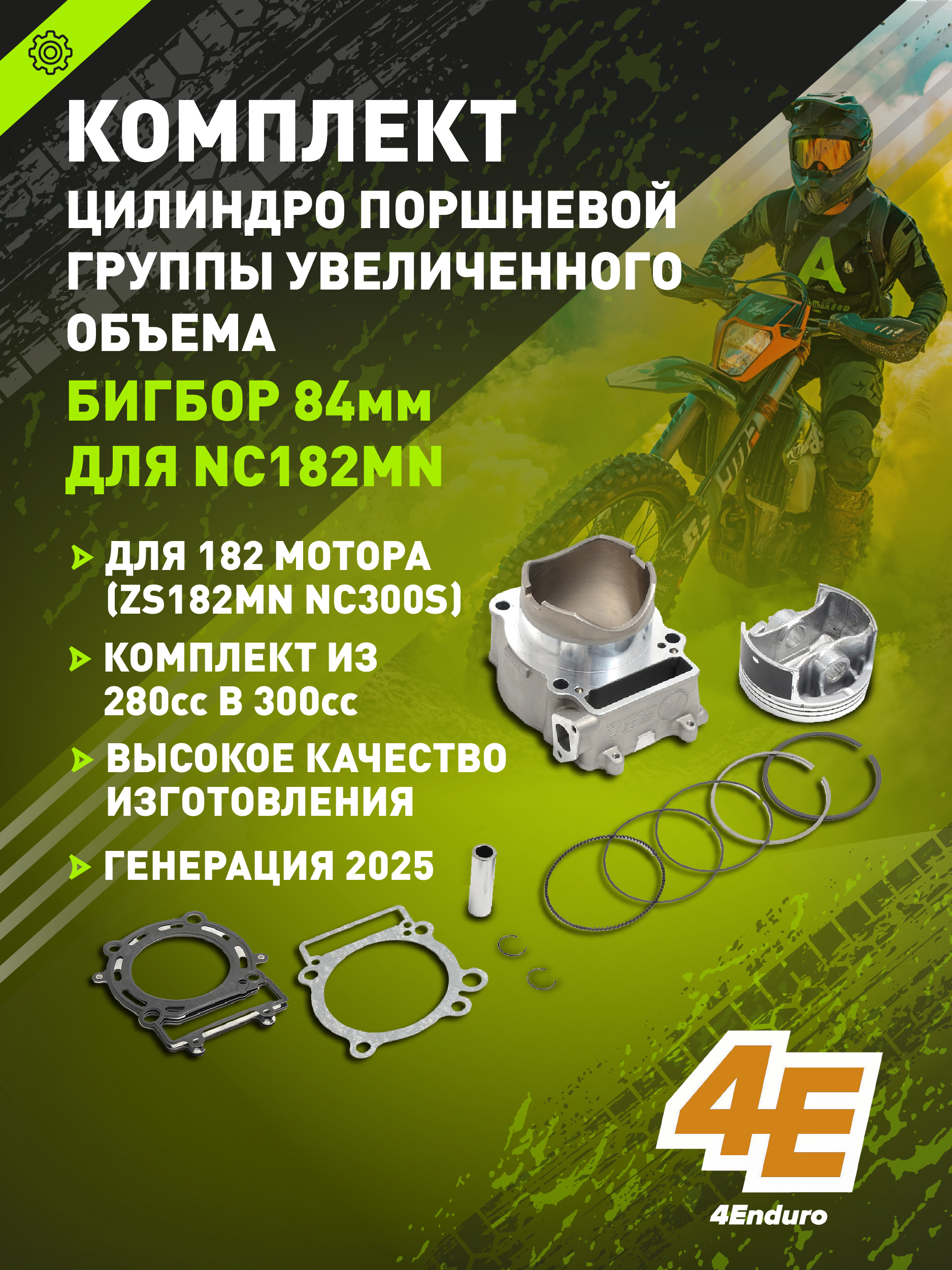 Комплект ЦПГ Big Bore предназначен для увеличения рабочего объёма двигателя Zongshen 182 MN до 300 куб. см за счёт установки поршня диаметром 84 мм. Полностью готов к установке и включает все необходимые детали для замены стандартной группы. Не совместим с моторами 177 серии — только для 182 двигателя.
