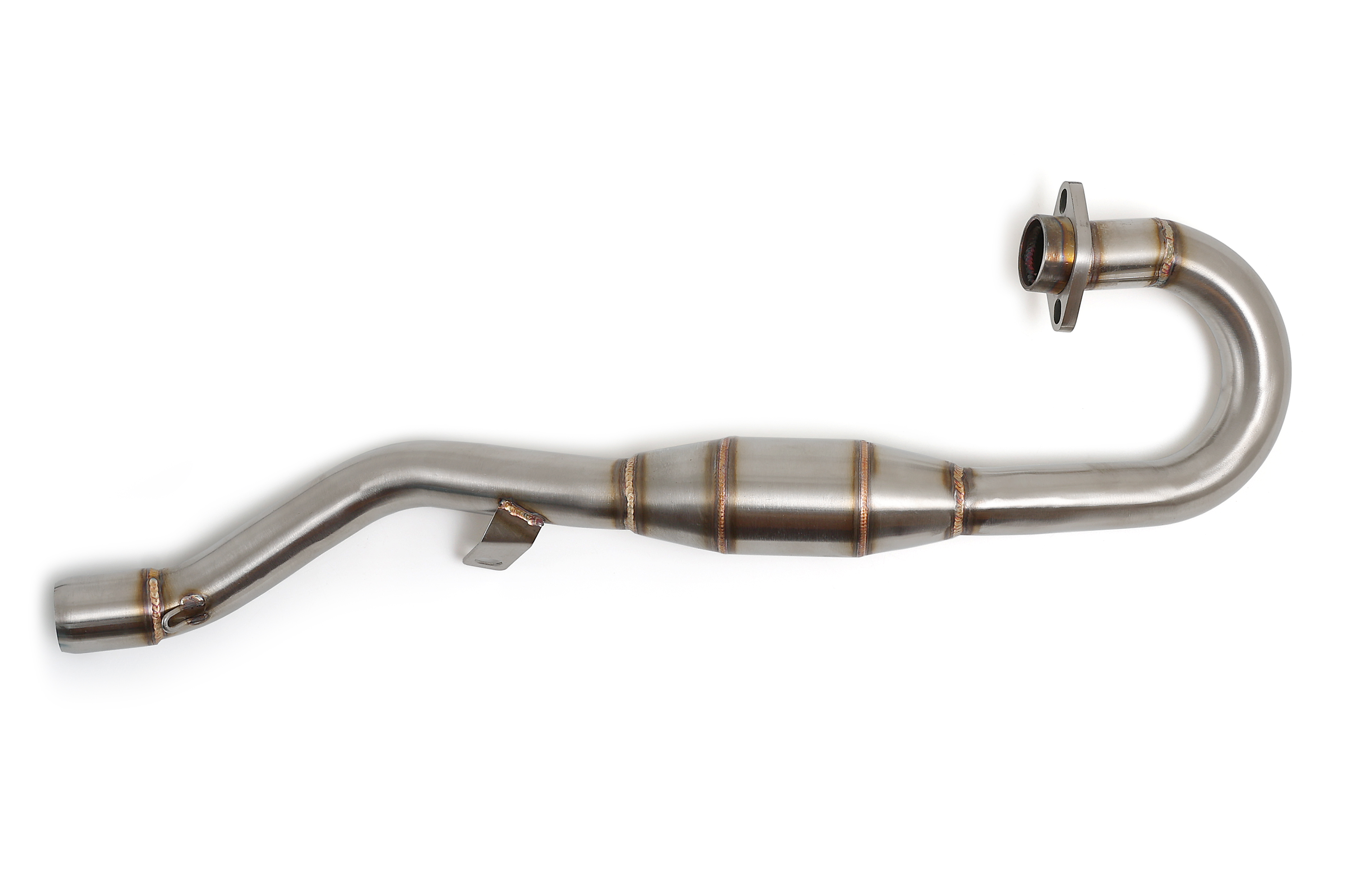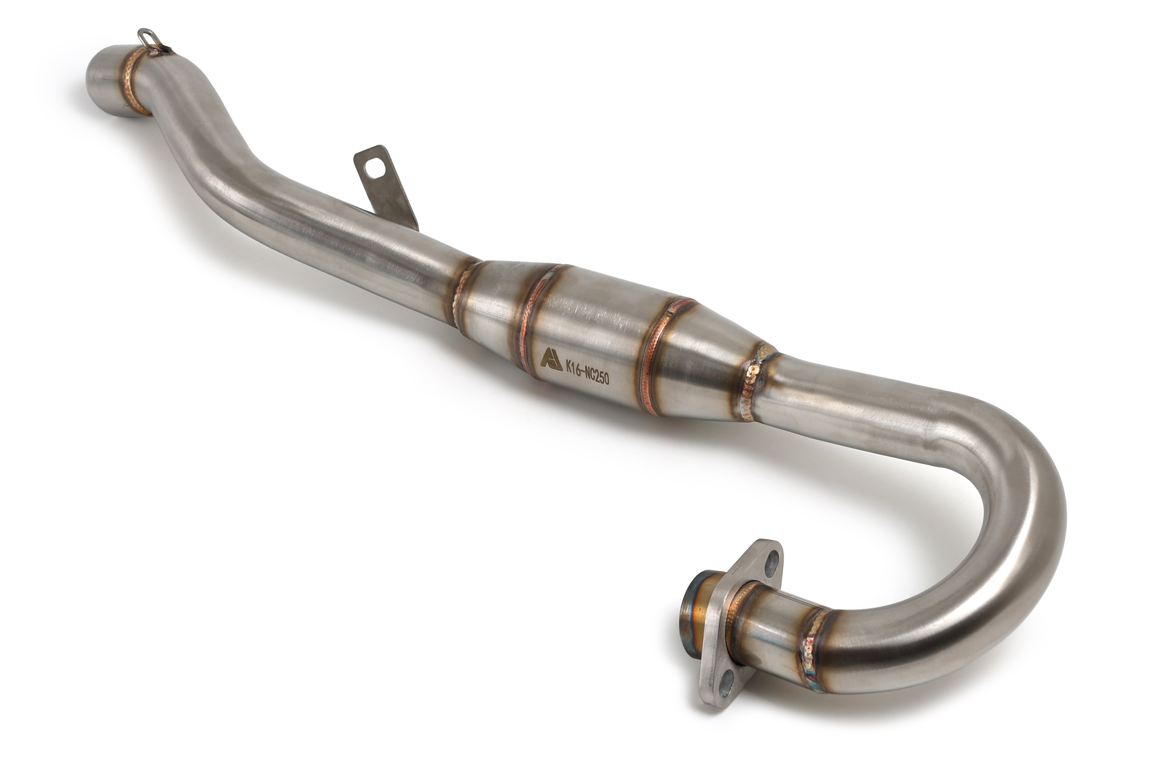 Приёмная часть выхлопной системы для эндуро мотоцикла NC300 KEWS K16 с расширительной камерой типа «пауэрбомб». Такое исполнение способствует улучшению наполнения цилиндра, более ровной тяге и лучшему отклику на ручку газа по сравнению со штатной трубой.