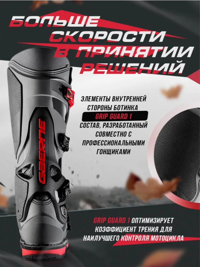 Мотоботы Gaerne SG22 — профессиональная экипировка для победителей, созданная с применением инновационных технологий итальянского бренда. Эти ботинки разработаны для гонщиков, стремящихся к максимальным результатам. Технологичные особенности: • Алюминиевые застёжки Aluminium Superlight Buckles — облегчённая конструкция с новой окраской, верхняя застёжка регулируется в 3 положениях • Система вентиляции Air Vents — эффективный отвод тепла и влаги в сочетании с усовершенствованной подкладкой • 3D накладка на носке Main Body Toe Box — снижает высоту на 9 мм для более быстрого переключения передач • Регулируемый щиток голени Frontal Shin Guard — 2 положения регулировки, совместимость с наколенниками • Облегчённый стальной бампер Steel Bumper 1 — матовая поверхность, уменьшенная толщина без потери защиты Защитные системы: • Покрытие Grip Guard 1 — разработано совместно с гонщиками для оптимального контроля мотоцикла • Подошва Dual Density Sole — двойная плотность для сцепления и амортизации • Технология Razorback — улучшенная подвижность голеностопа • Двухшарнирная система Dual Stage Pivot System — защита от травм лодыжки • Амортизирующая пятка G-Microshock Heel Pad — поглощение микроударов Рекомендации по подбору размера: • Используйте официальную размерную сетку Gaerne • Для широкой стопы может потребоваться размер больше • В описании указаны ориентировочные соответствия российским размерам • Рекомендуем примерку при возможности Производство: Сделано в Италии с соблюдением традиционных стандартов качества Gaerne. Эти мотоботы сочетают последние технологические разработки с проверенным итальянским качеством изготовления. Мотоботы Gaerne SG22 — это выбор профессионалов, созданный для тех, кто не ищет компромиссов между защитой, комфортом и спортивными результатами.