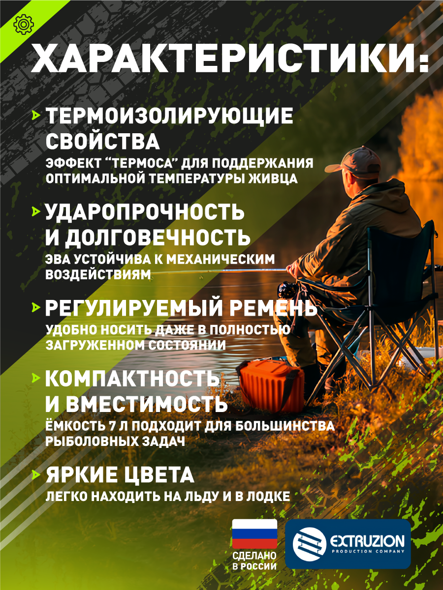 - Компактность и вместимость — ёмкость 7 л подходит для большинства рыболовных задач