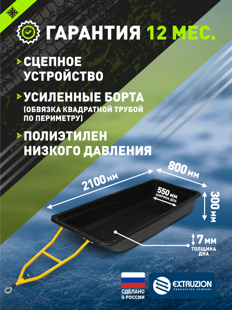- Крупногабаритные сани-прицеп для профессионального использования с снегоходами и мотобуксировщиками. Увеличенная длина 2100 мм обеспечивает повышенную вместимость для перевозки объемных грузов. Изготовлены из сверхпрочного ПНД с УФ-стабилизацией. Полная комплектация сцепным устройством и стропами обвязки.