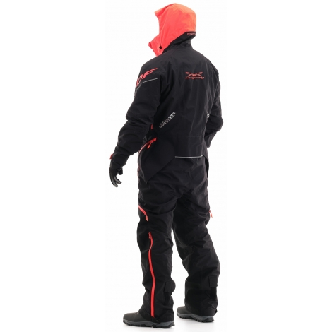 Комбинезон предназначен для снегохода и сноубайка. Надежно защитит от ледяного ветра и мокрого снега. Ткань верха дополнительно содержит тефлоновое водоотталкивающее покрытие. Внешние молнии влагозащитные. Проклеены все швы. На рукавах есть эластичные манжеты, на штанинах снегозащитные юбки с петлёй для фиксации к ботинкам. При закрытой вентиляции и карманах комбинезон герметичен.