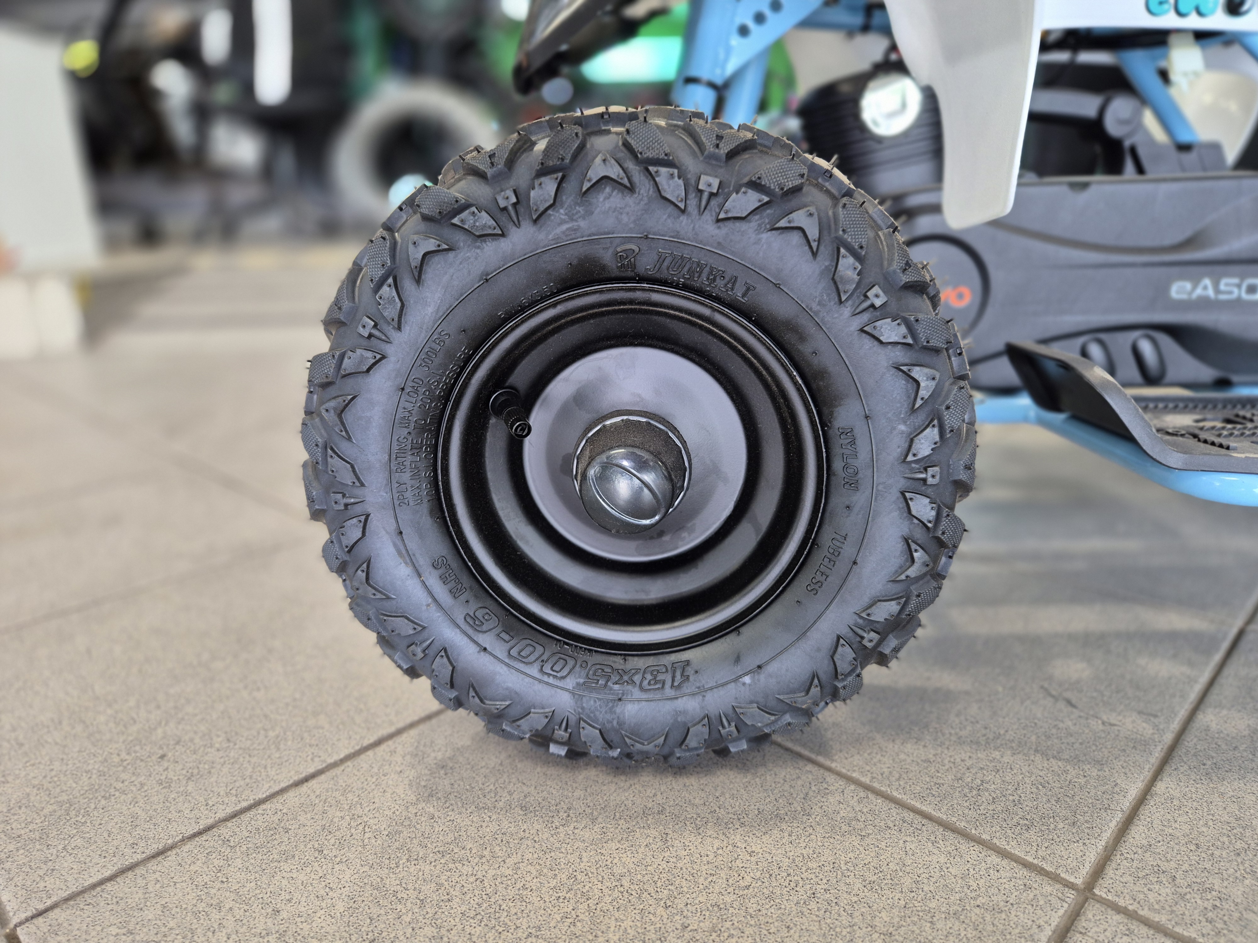 Диаметр колёс 6 дюймов. Амортизация спереди отсутстсвует. На задних колёсах установлен моноамортизатор длиной 200 мм. Спереди и сзади установлены механические дисковые тормоза.