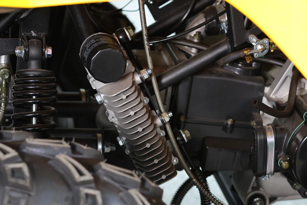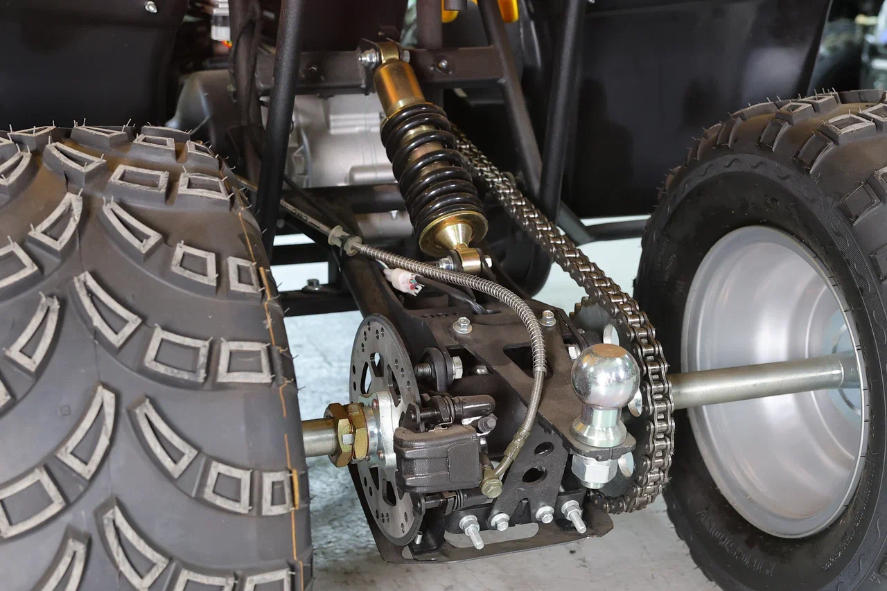 Независимая передняя подвеска позволяет легко маневрировать и держать уверенно курс. В наличие задний ход. На квадроцикле установлены большие внедорожные шины размером 23 дюйма передние и 22 дюйма задние. На задней оси установлены дополнительные защитные кожухи.