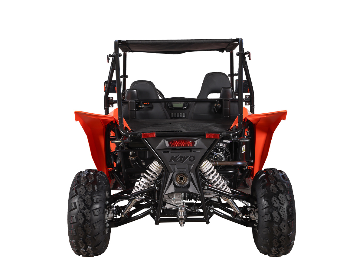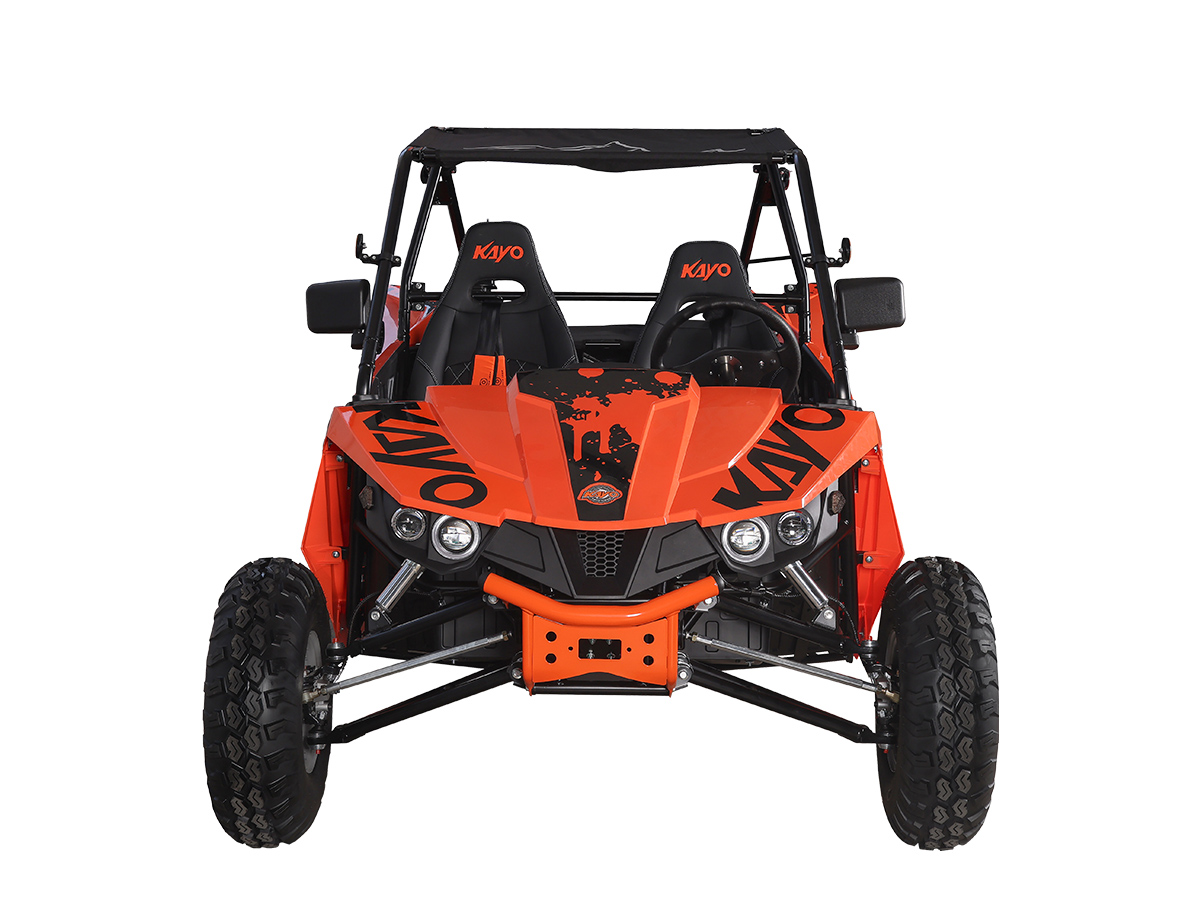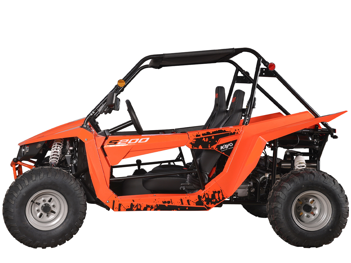 Среди конструктивных особенностей необходимо отметить мощную раму оригинальной разработки, которая обеспечивает прочность и долговечность конструкции. Облицовка багги выполнена из прочного пластика, а крыша из износостойкого мягкого материала. Также имеется электронная приборная панель с информативным ЖК-экраном, обрезиненные рулевое колесо и рычаг ручного тормоза, которые позволят райдеру мгновенно реагировать на изменения дорожных условий и маневрировать в любых ситуациях. KAYO S200 идеально подходит для поездок за город в поисках приключений или для семейного отдыха.