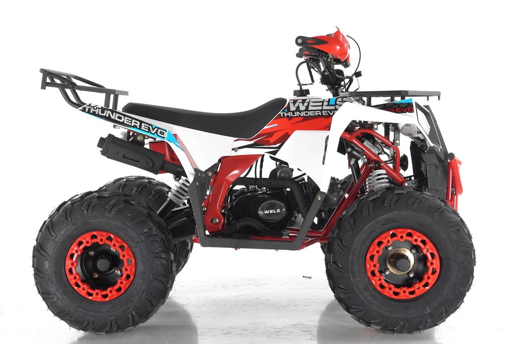 Стильная современная новинка 2019 года от компании WELS - квадроцикл для детей и подростков WELS THUNDER EVO X 125 предназначен для детей и подростков и обладает всеми необходимыми характеристиками, чтобы ребенок чувствовал себя на рулем настоящего квадроцикла, а его родители при этом были бы спокойны за безопасность юного пилота. ЛЮКСовая версия отличается от обычной наличием зеркал, дополнительной светодиодной оптики, спортивным глушителем, также квадроцикл укомплектован песочной резиной. 125 кубового мотора вполне хватает для непоседливых гонщиков. Если же Вам кажется, что этого много - воспользуйтесь ограничителем скорости. Дисковые тормоза спереди и сзади обеспечат своевременную остановку перед препятствием. Защита рук в комплектации оградит ребенка от ударов веток и других помех. Песочная резина. Большие колеса 19,7-8, зад.: 18,9.5-8. Наличие укрепленных багажников спереди и сзади позволит установить на квадроцикл кофр и выезжать на природу с необходимым набором вещей и инструментов. Светодиодные фары для передвижения в темное время суток. Моточасы, светодиодные фары, звуковой сигнал, колпаки - все включено в комплектацию. Доступен в расцветках: черно-красный, бело-красный, живописно-красный, зеленый камуфляж