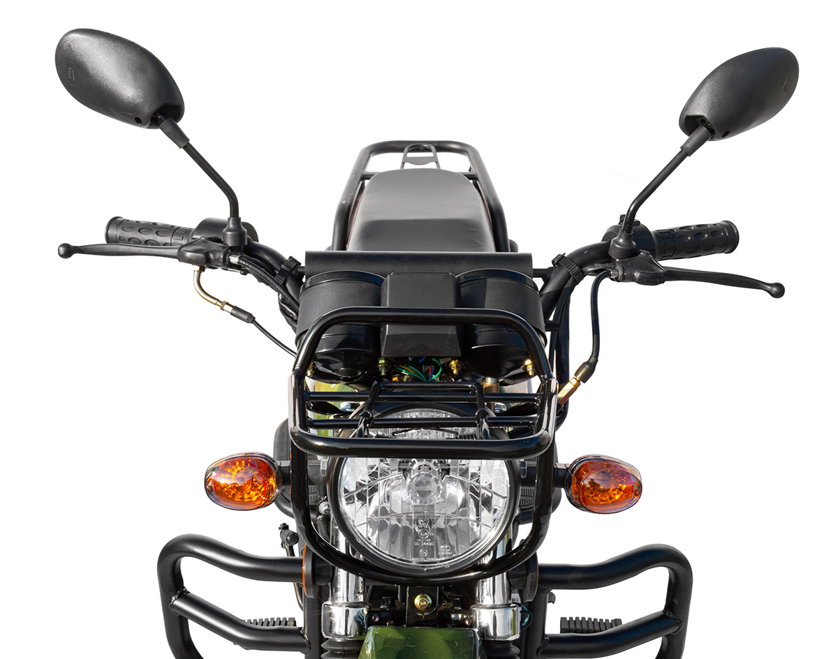 Из особенностей комплектации данной модели следует отметить спицованые колеса и переднее крыло «кроссового» типа, из гибкого и прочного пластика. Высокий клиренс и подбор комплектующих для этой модификации мопеда Alpha говорит о готовности мототехники к использованию на проселочных дорогах и тропинках бездорожья, где также пригодятся комплектные багажники для крепления кофров и транспортировки грузов, располагающиеся спереди над фарой и позади сиденья. Возможности перевозки полезных грузов дополняют боковые складывающиеся платформы, которые размещены у заднего колеса с левой и с правой стороны.