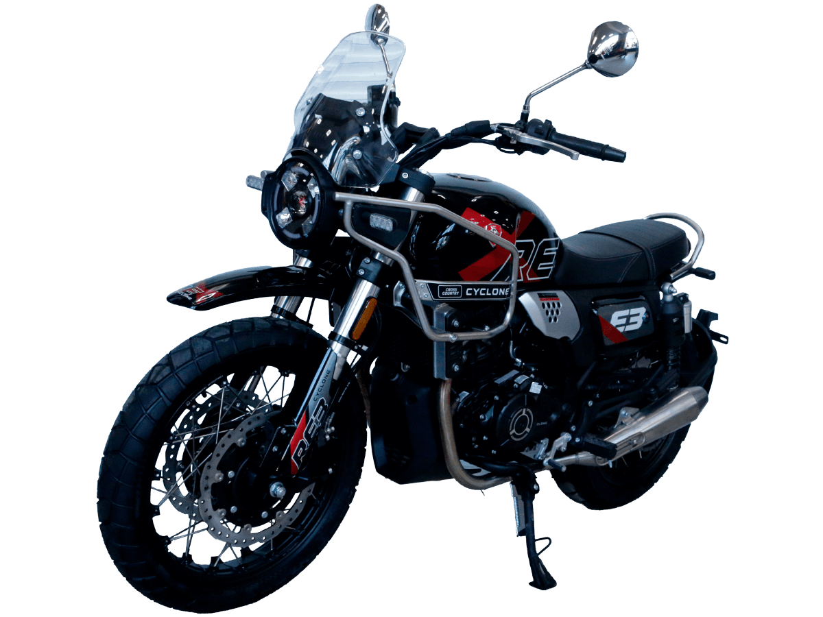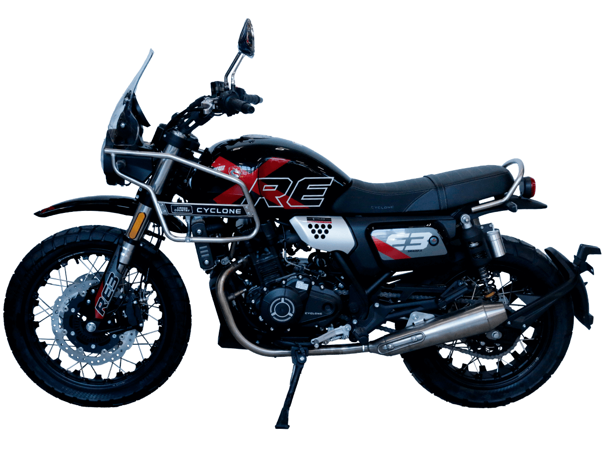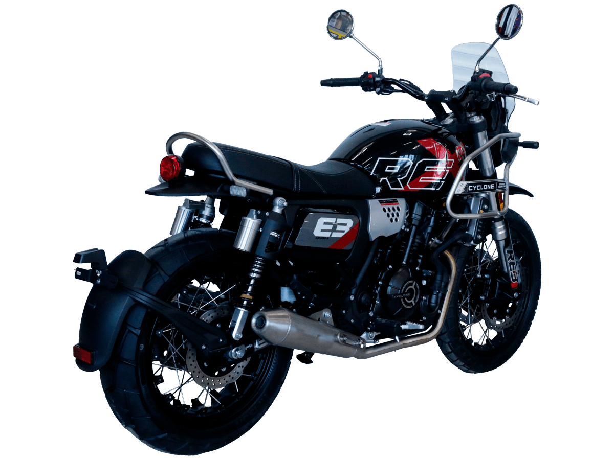 CYCLONE RE3 Scrambler (SR400-A) – универсальный мотоцикл, объединяющий в себе черты городского мотоцикла и эндуро. Управляя им, можно бросить вызов и городским пробкам, и скоростным автострадам, и всевозможному лёгкому бездорожью. Его дизайн отдаёт дань уважения каферейсерской тематике.