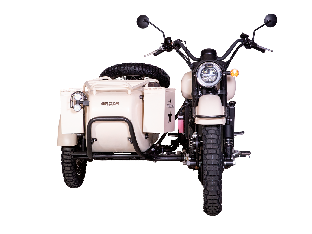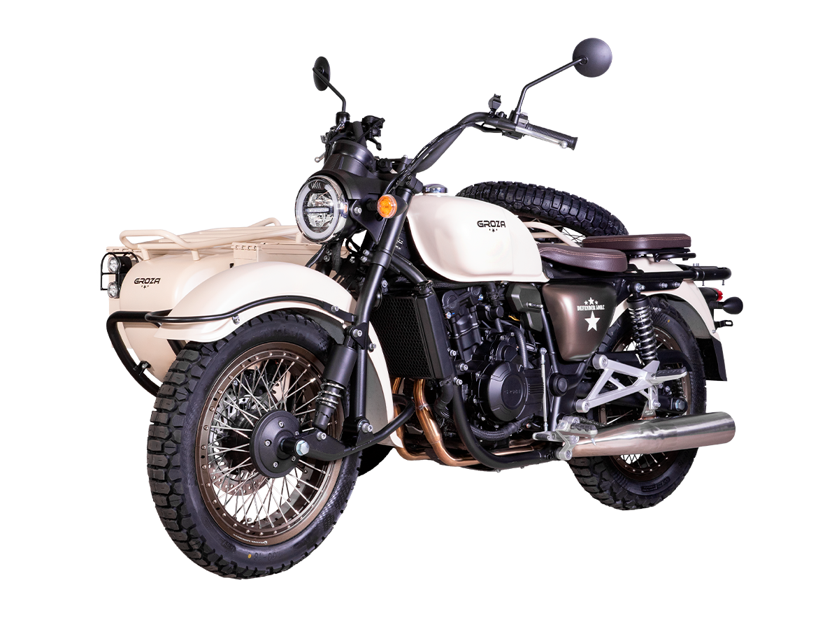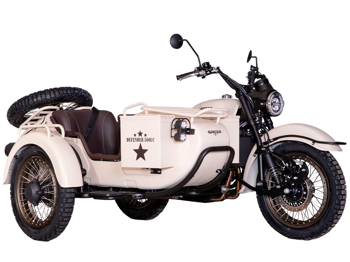 GROZA Defender 500 LC 4T EFI – легендарная модель, представляющая собой сайдкар в стиле ретро-милитари, и напоминающая культовый советский “Урал”. Байк оснащён изящными олдскульными фонарями и имеет покраску под фактуру некрашеного алюминия, как у истребителей 50-60 гг. Данная модификация является усовершенствованной моделью Defender 500 и оснащена гораздо более серьёзным мотором.