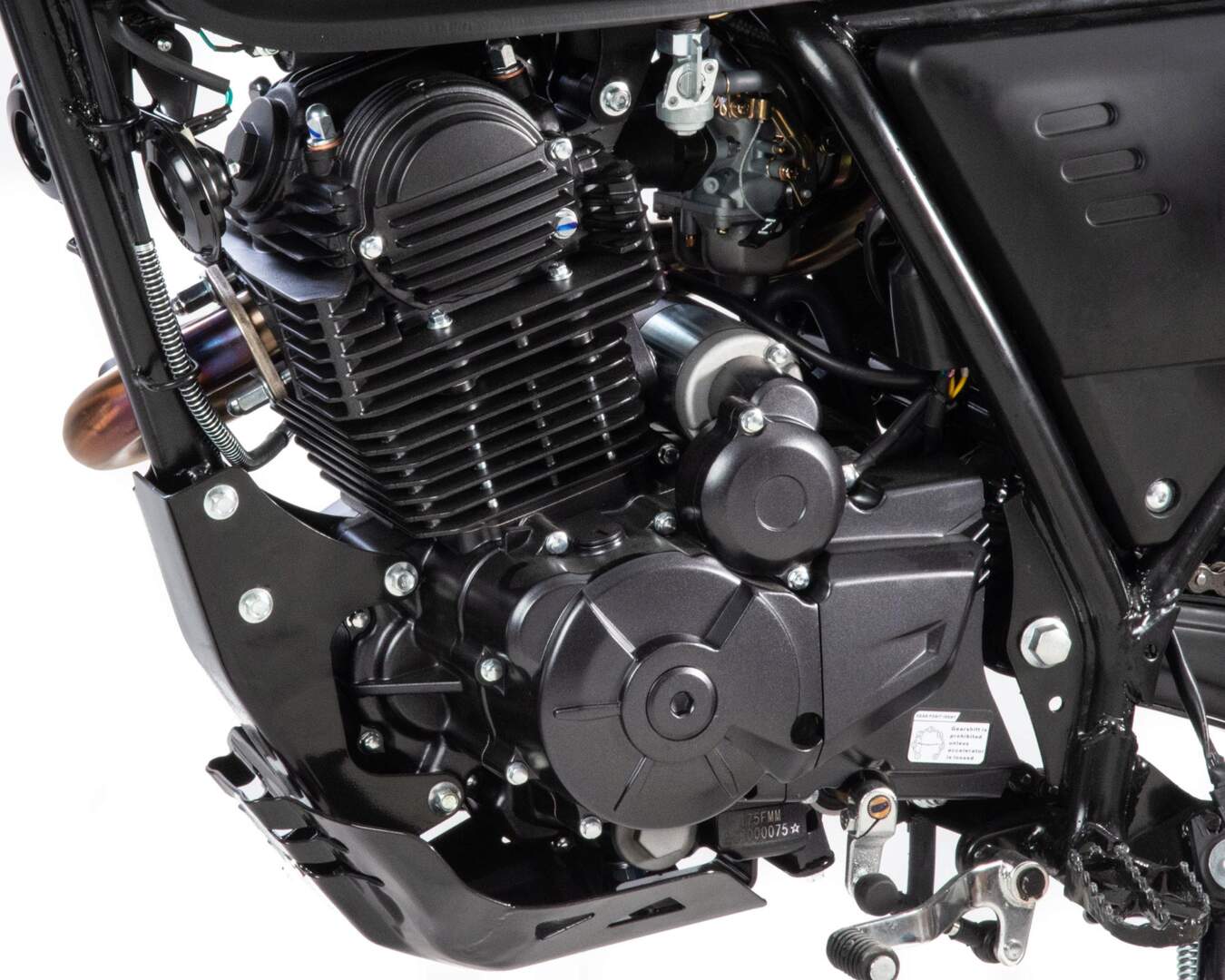 Мотоцикл оснащен двигателем 175FMM-5 (баланс. вал) с 6 ступенчатой коробкой передач, мощностью 25 л.с. Впуск оснащен карбюратором Keihin PZ30, выпуск – титановым выхлопом от Motoland.