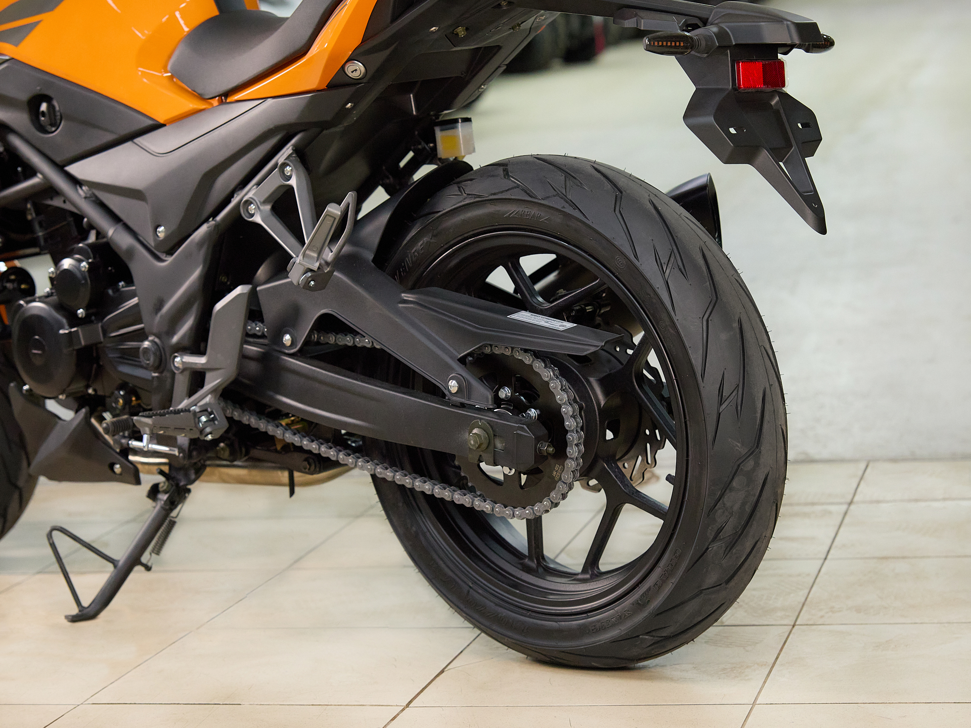Хорошо подобранные покрышки на 17" ободах, 110/70 и140/70, обеспечивают отличное сцепление с дорожным покрытием.