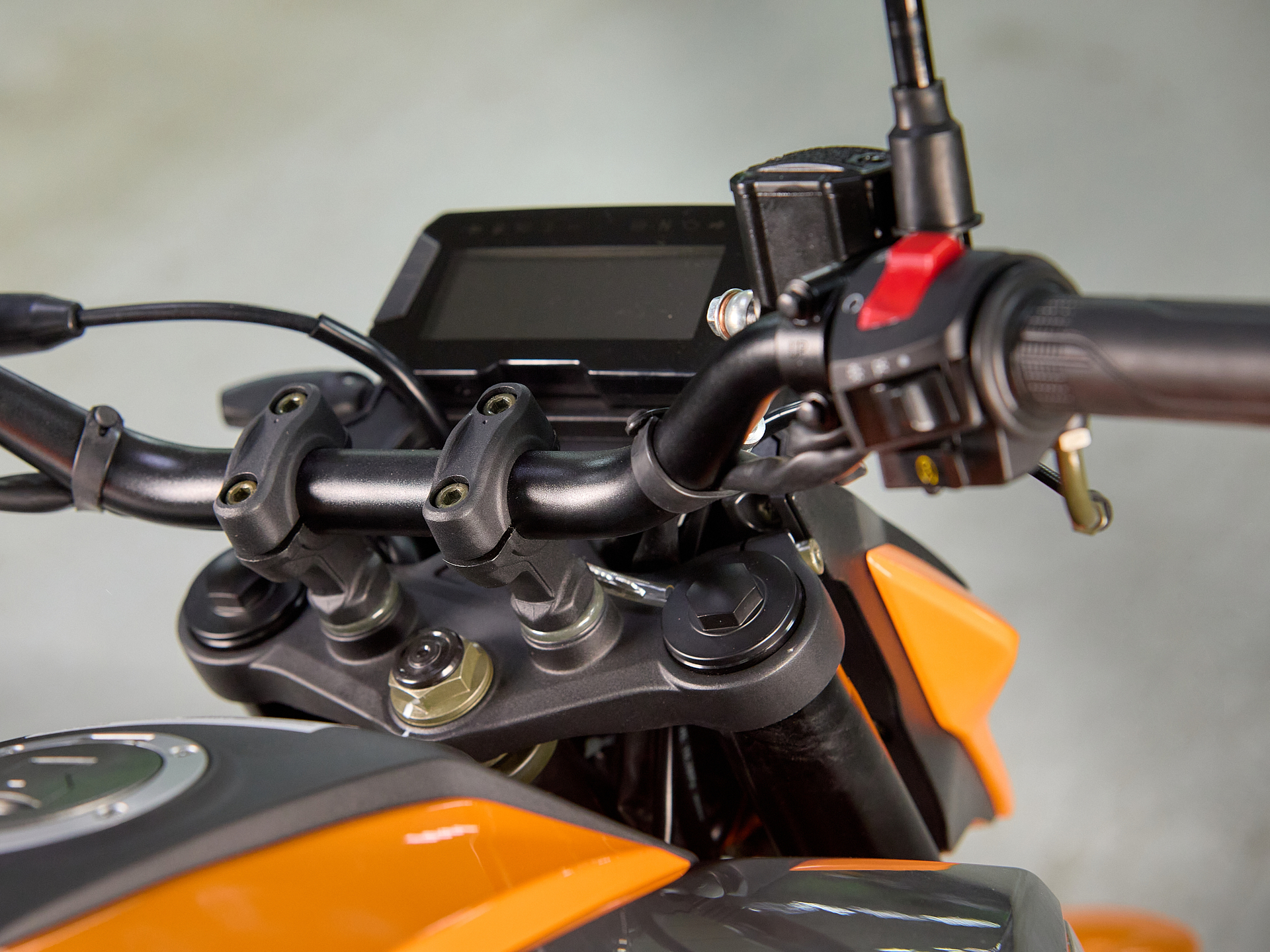 Передние и задние суппорта 4-х поршневые. Глушитель прямоточный Akrapovic с увеличенным диаметром трубы. Руль двойной усиленный переходного сечения.