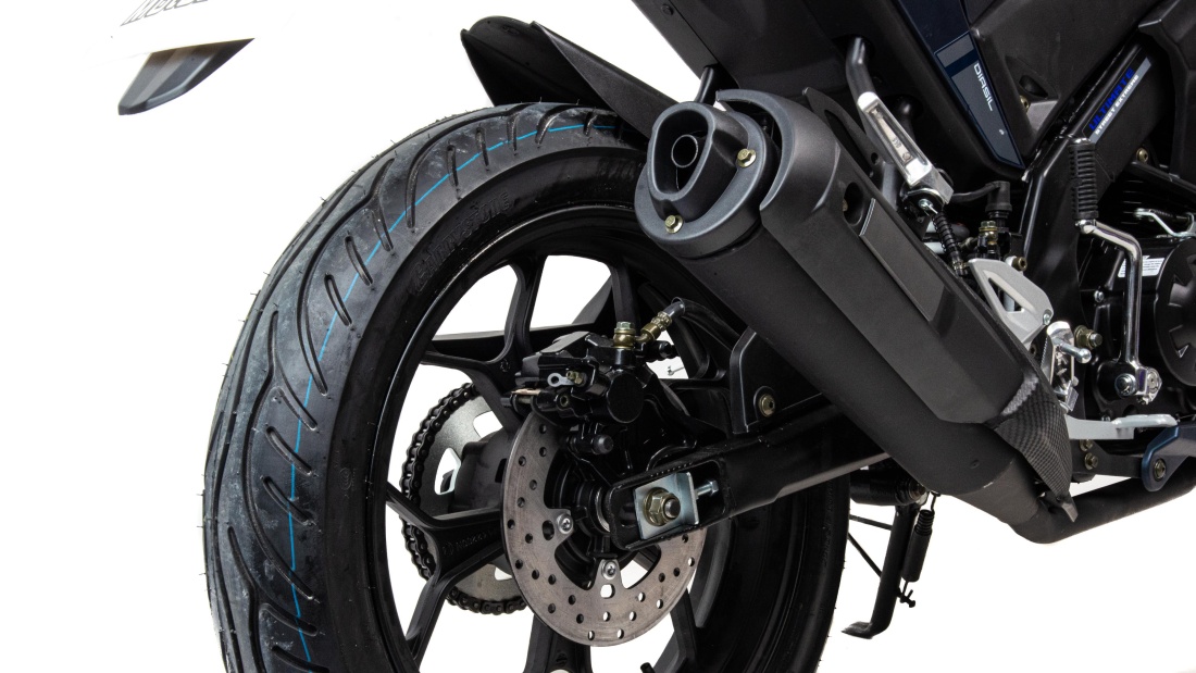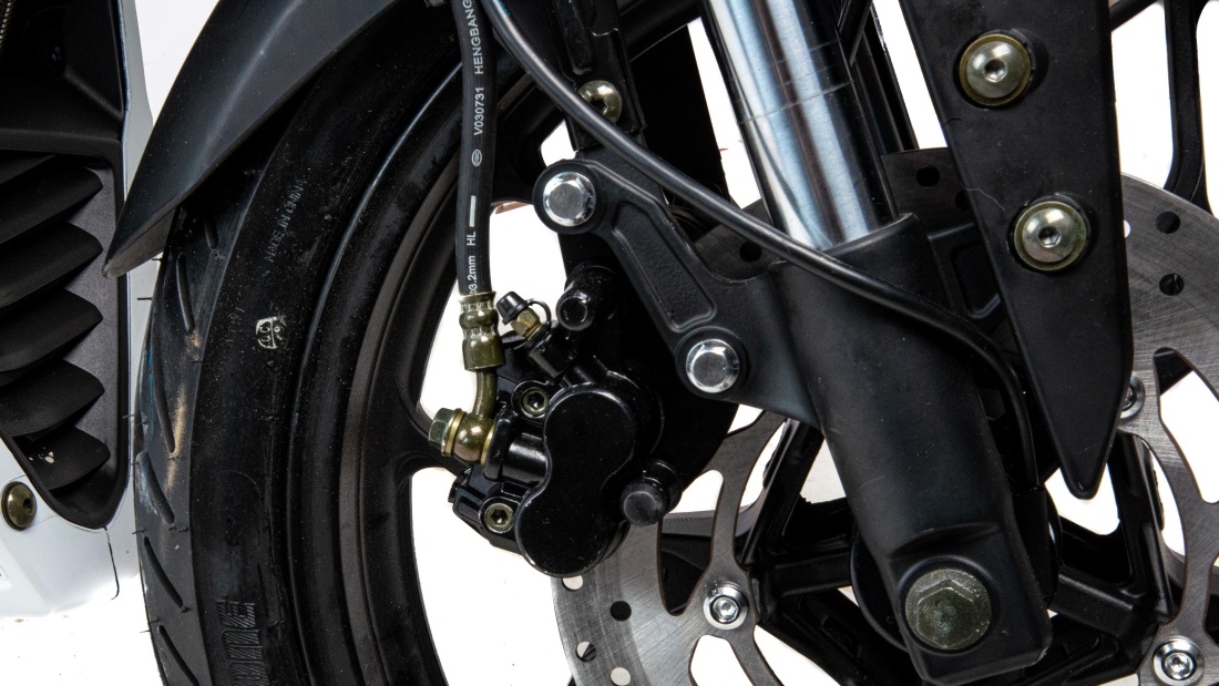 Двух поршневые передние суппорта, литые алюминиевые колёса, передняя вилка перевёрнутого типа, с увеличенным ходом, обеспечивает комфорт и прекрасную управляемость при езде по городским дорогам.
