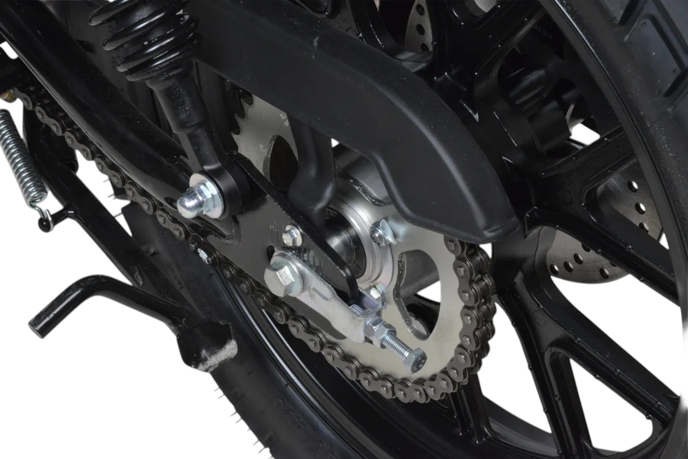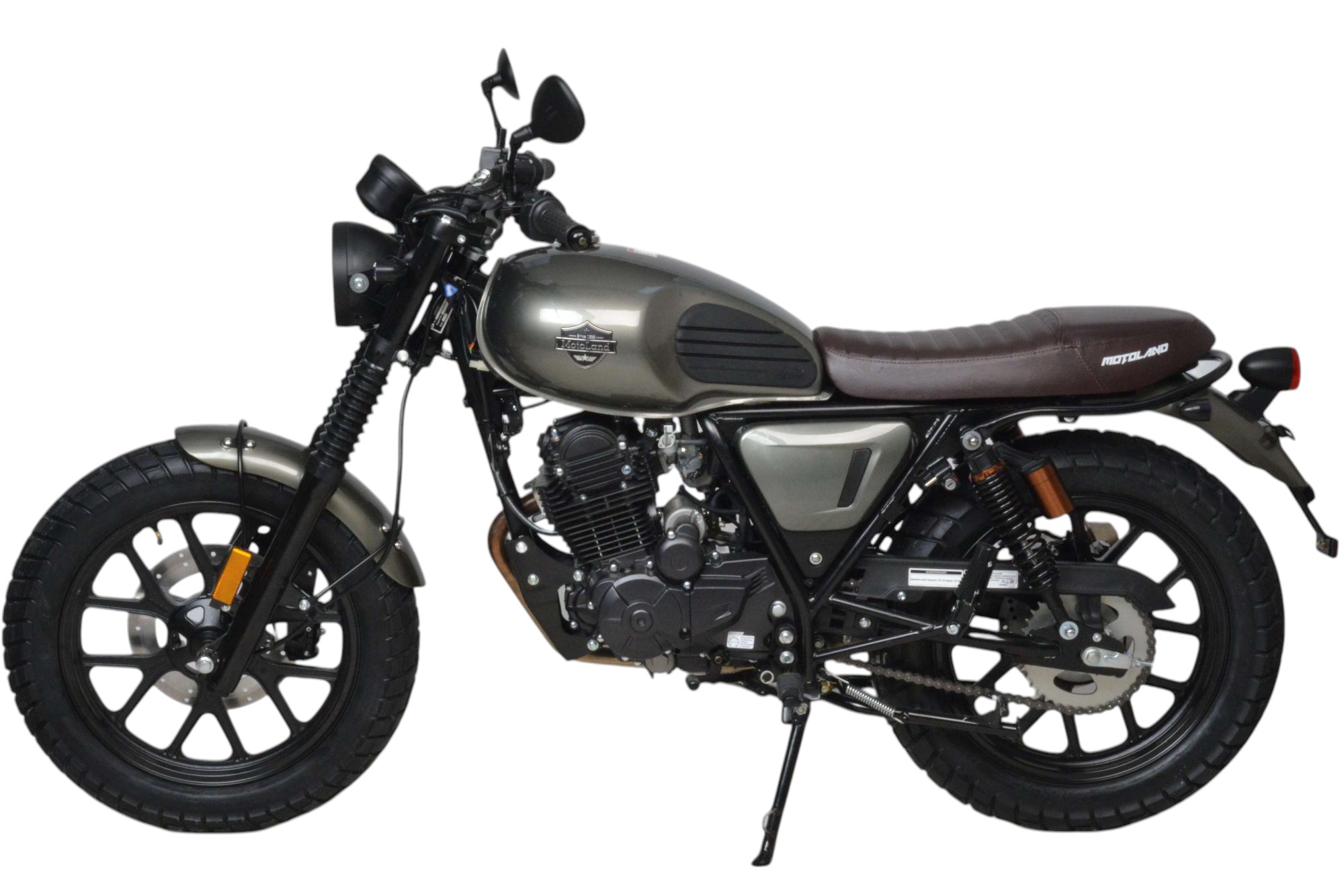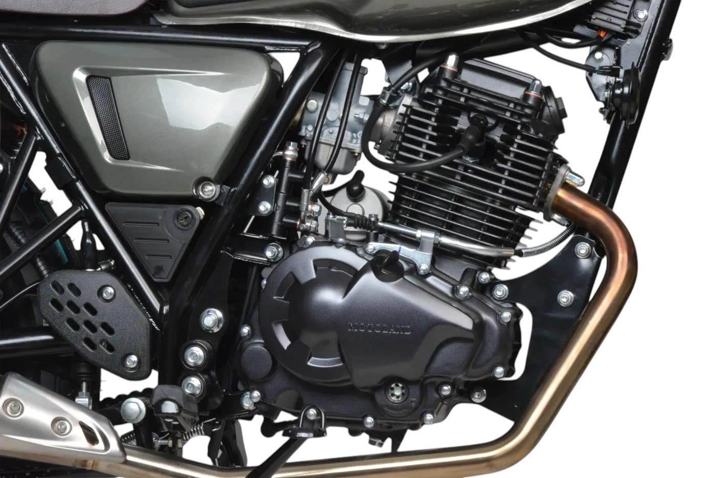 Мотоцикл оснащен двигателем 175FMN (баланс. вал), с 6 ступенчатой КПП, мощностью 25 л.с. Установлен усиленный толстостенный руль.