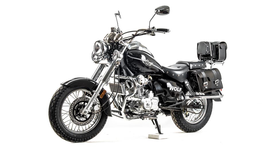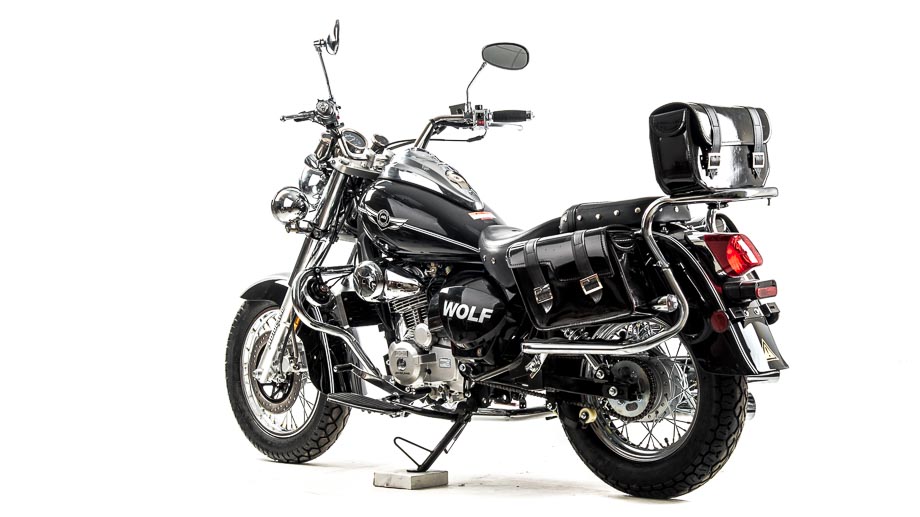 Чоппер WOLF 250 сразу привлекает внимание своим внешним видом. Выполнен в винтажно-классическом стиле с удлинённой рамой и передней вилкой, обилием хромированных элементов. Солидный, матово-чёрного цвета — этот чоппер выглядит значительно лучше своей ценовой категории.