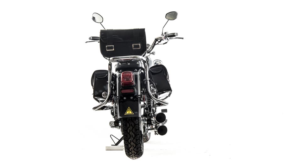Трансмиссия механическая, включает 5 скоростей. Подножки удобные, дают возможность легко переключать передачи. Мотоцепь 420 защищена специальным кожухом. На чоппер установлены 2 выхлопные трубы.