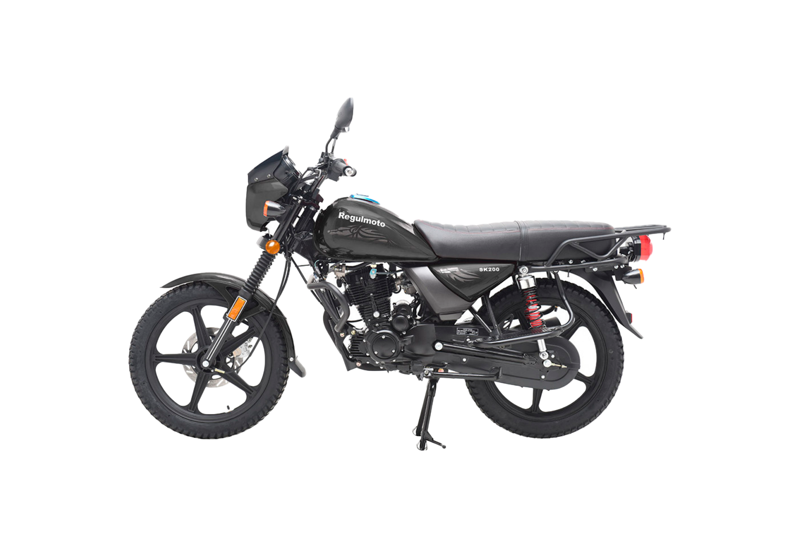 Несмотря на «классический» вид Regulmoto SK200, в комплектации мотоцикла используются современные стильные литые диски колес, световое оборудование на экономичных и долговечных светодиодах, электронное зажигание, ротор дискового тормоза на переднем колесе. Байк полностью готов к эксплуатации на ДОПах: кроме комплекта светотехники и удобной приборной панели, на руле мотоцикла также установлены зеркала заднего вида.