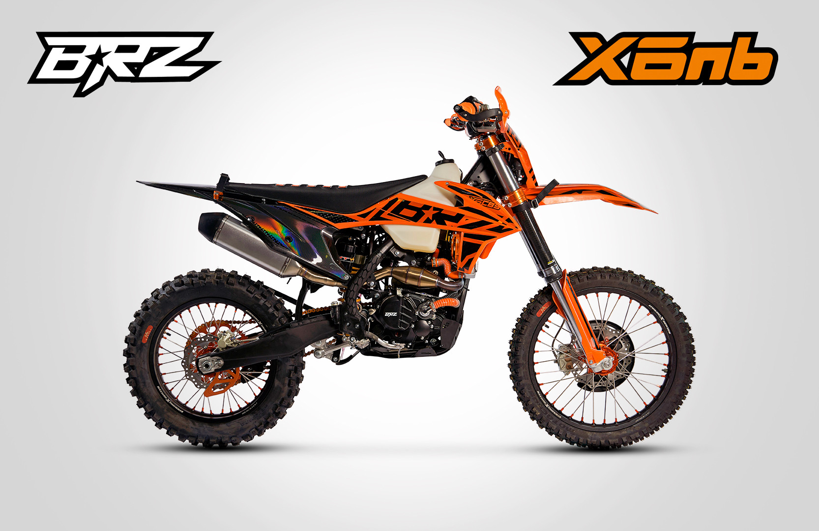 BRZ X6nb выполнен в дизайне KTM 2020-2022. Особую индивидуальность подчеркивает применение разного цвета пластика на передней и задней части мотоцикла. Задняя часть у всех моделей черного цвета. Передняя же часть выполнена в собственной цветовой схеме. Также получила новый дизайн фара головного света. Она стала пятидиодная с нижней «ресничкой». Особое внимание уделено наклейкам. В дизайне графики использованы новые технологии, которые позволили сделать отдельные элементы с зеркальным эффектом. Цвета всех элементов подобраны таким образом, чтоб мотоцикл был внешне максимально гармоничным и законченным.