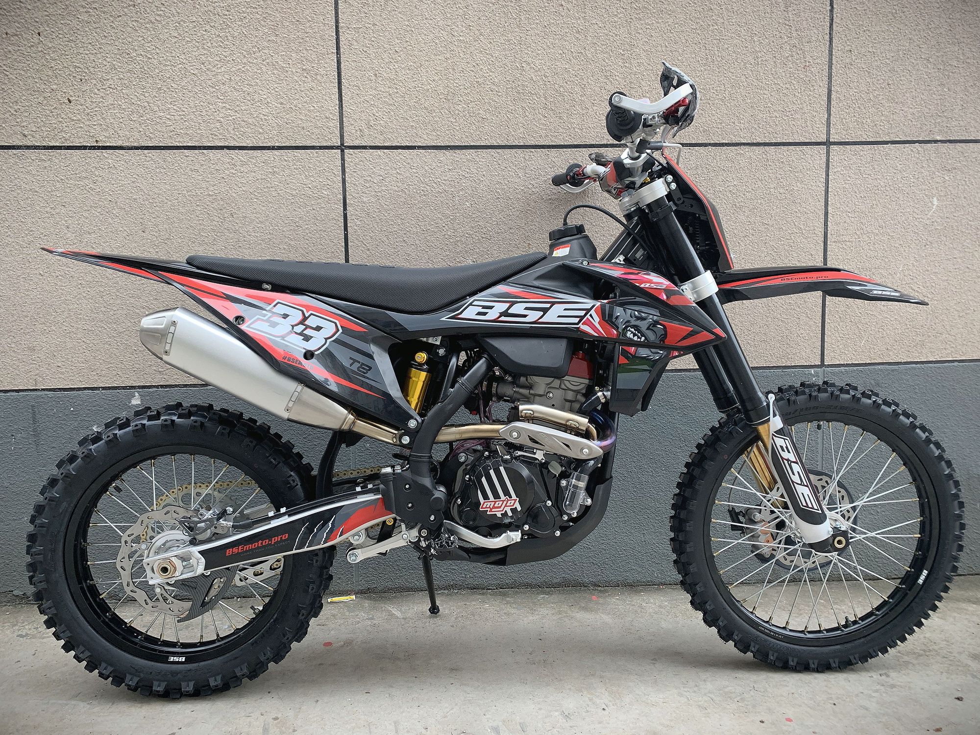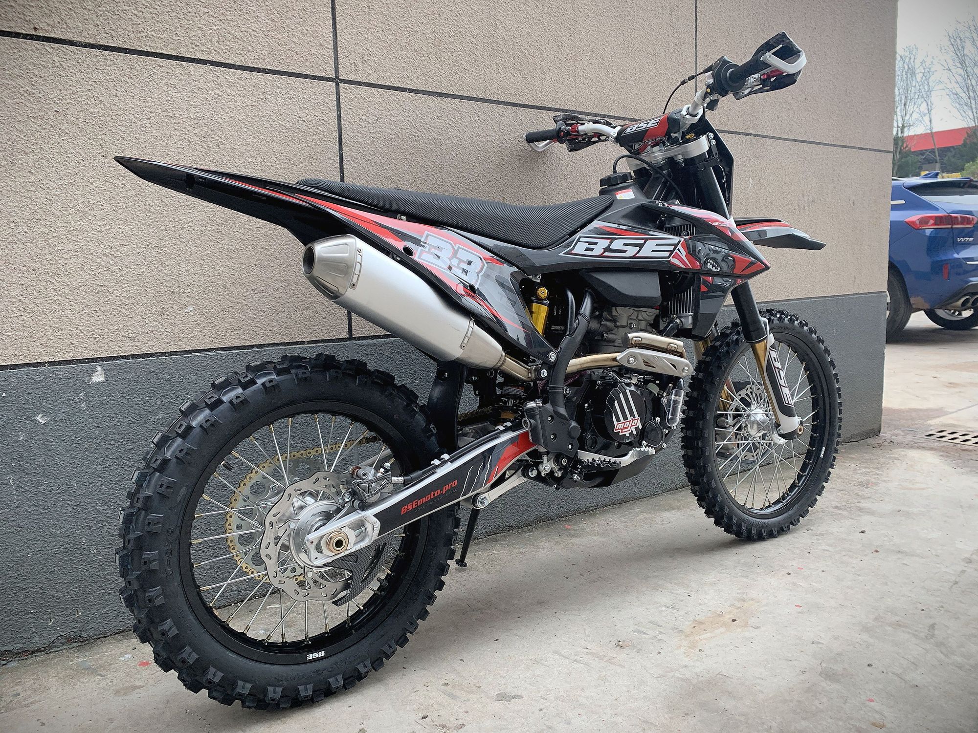 Разработка подвески BSE Mojo Racing производилась опытными инженерами-подвесочниками завода, а настройка - под чутким контролем заводской спортивной китайской командой BOSUER. Спереди установлена полностью регулируемая вилка «перевертыш» BSE Mojo Racing c перьями диаметром 53/58.5 мм, 930 мм. Сзади установлен полностью настраиваемый моноамортизатор BSE Mojo Racing 480 мм.