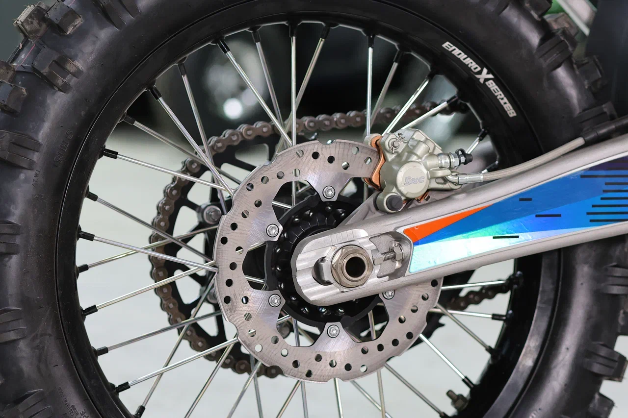 Мотоцикл оснащён классическими спицованными колёсами диаметром 18 и 21 дюйм. Эффективное и безопасное замедление с любых скоростей обеспечивают гидравлические дисковые тормоза – спереди установлен 2-поршневой суппорт SZC и тормозной диск диаметром 260 мм, а сзади – однопоршневой суппорт SZC с диском диаметром 220 мм. Мотоцикл достаточно компактен и имеет вес всего 116 кг. Топливный бак вмещает 8 литров горючего.