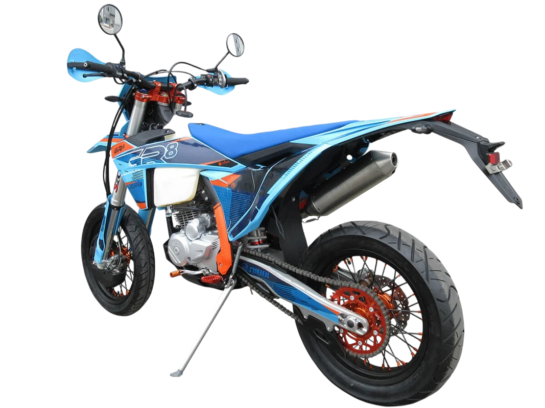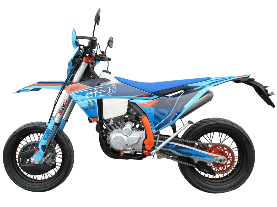 Мотоцикл-мотард GR8 F300A (4T CB300RL) Motard 2024 модельного года является городской версией модели GR8 F300A, адаптированной под езду по асфальту, имеющей шоссейную резину, полный набор светотехники и ПТС. Этот мотоцикл представляет собой оптимальный баланс производительности и технической оснащённости и создан для тех, кто не хочет расставаться с эндуро даже в городе. Идеальный снаряд как для гонок в классе супермото или стант-райдинга, так и для повседневной городской езды.