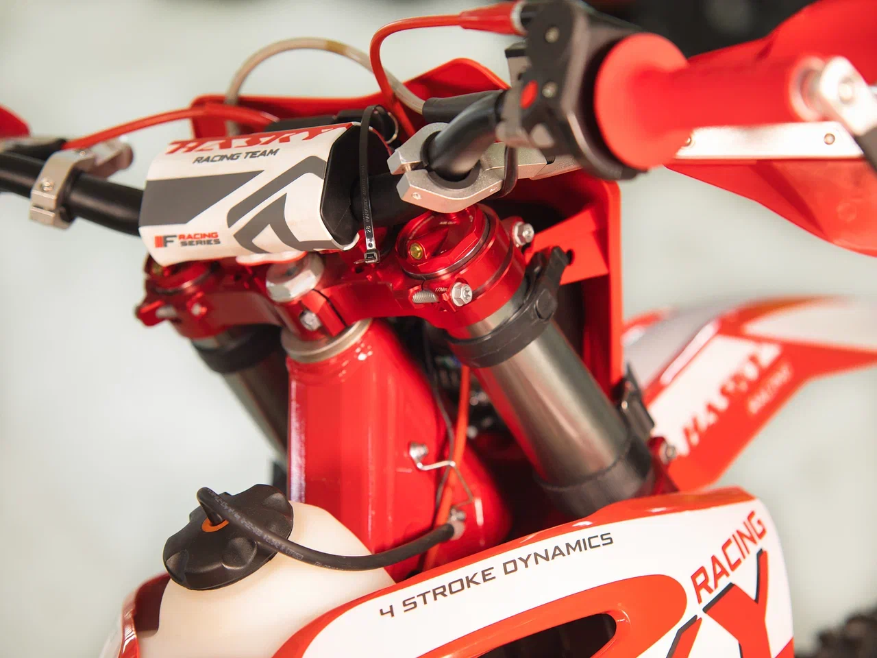 Траверсы CNC AJ1 новой конструкции двойного охвата вилки, для равномерного распределения нагрузки на передние амортизаторы компании HTW. А усиленный руль из сплава 7075 в паре с армированной защитой рук имеет возможность быть отрегулированным на траверсах с положением по горизонтали для настройки самой комфортной посадки. А чтобы закрыть вопрос комфорта окончательно, на мотоцикле установлены пеги (подножки) AJ1, которые имеют широкую форму, смещение назад и исключает налипание на них грязи.