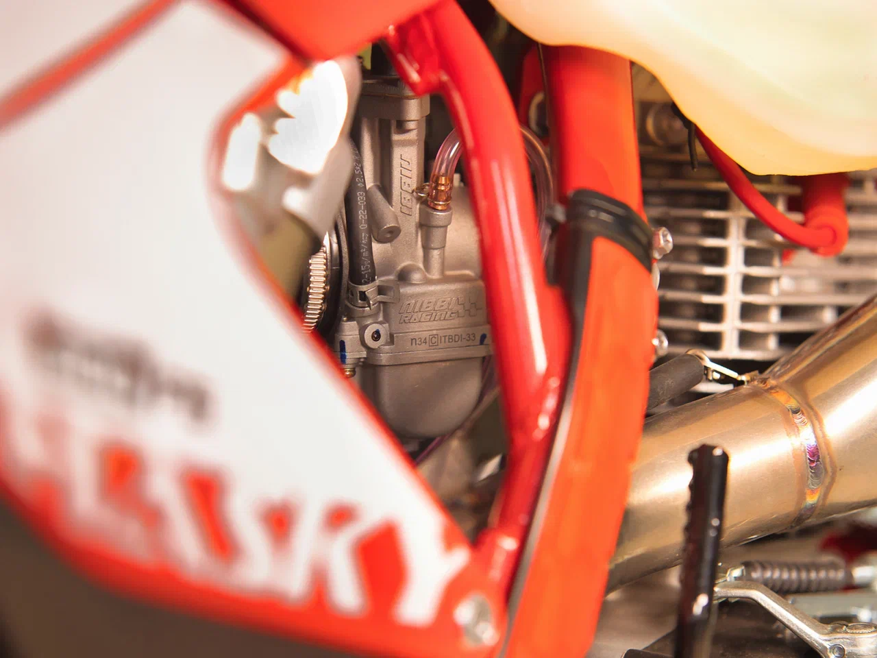 Выхлопная система тоже подверглась изменениям. Теперь труба от двигателя идет от узкого диаметра к широкому, что дает улучшенные характеристики для выбросов выхлопных газов, а банка глушителя с DB Killer не имеет аналогов среди конкурентов по своему весу. Так же, благодаря специальной форме Power Bomb, реплика CRF, снижена теплонагрузка на выпускной коллектор, что снижает риск получения травмы.