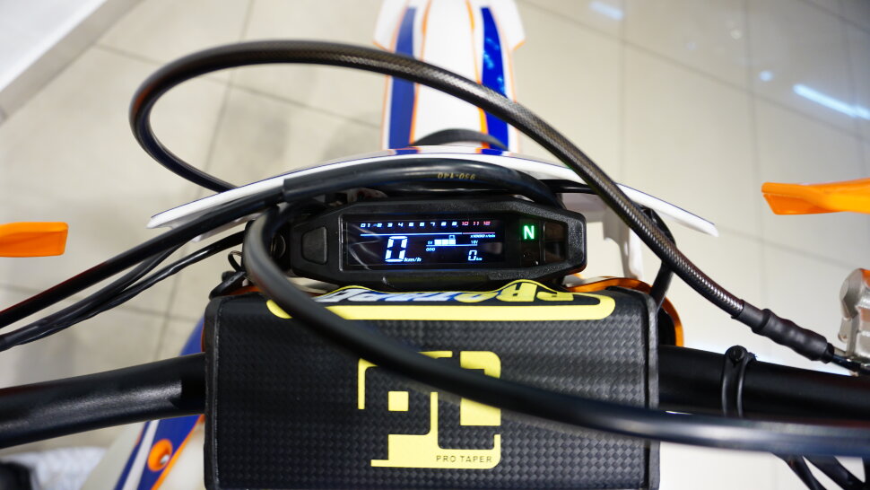 Влагозащищенная фара с пятью яркими диодами позволяет использовать мотоцикл в темное время суток.Задний габаритный фанарь.Прочная пластиковая защита рук Caken. Задний балон 120 для более большего пятна контакта. С Hasky F6 покарять новые высоты будет только в радость.