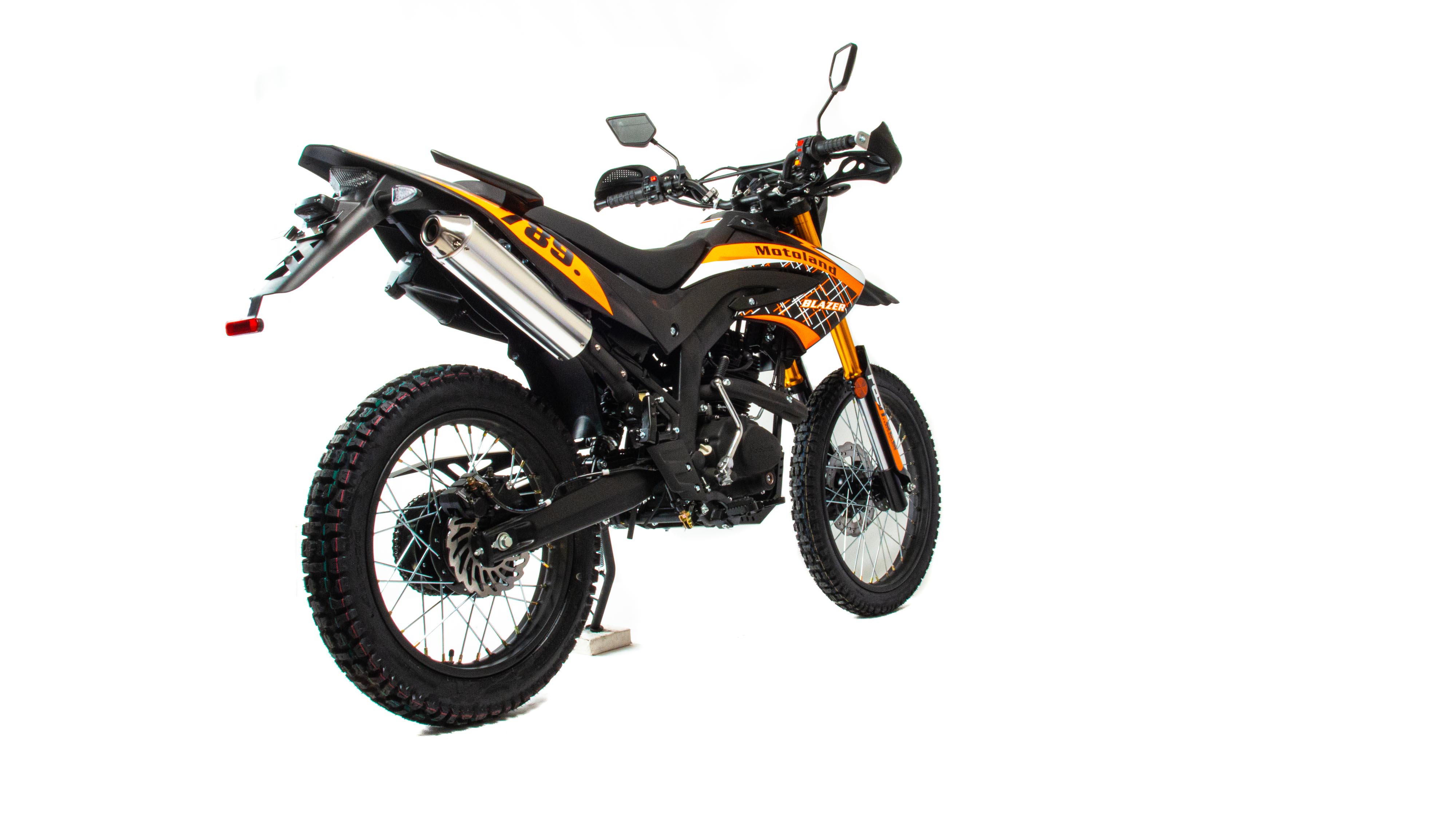 Motoland BLAZER 250 - отличный эндуро-мотоцикл по доступной цене. Двигатель 165FMM мощностью 16 л. с., усиленную «перевернутую» переднюю вилку, защиту двигателя и рук, LCD-панель, светодиодные поворотники и стоп-сигнал и кроссовую фару.