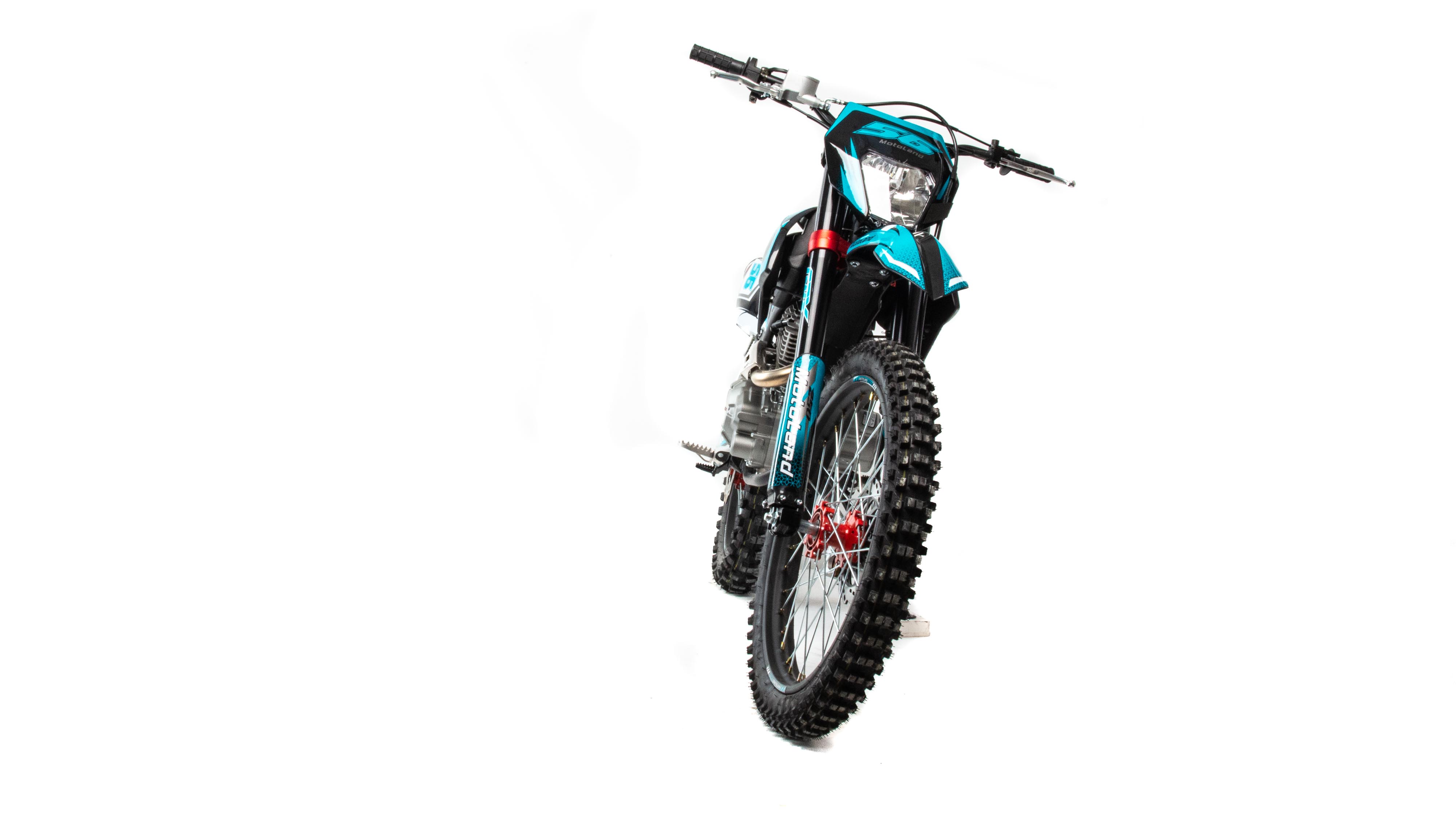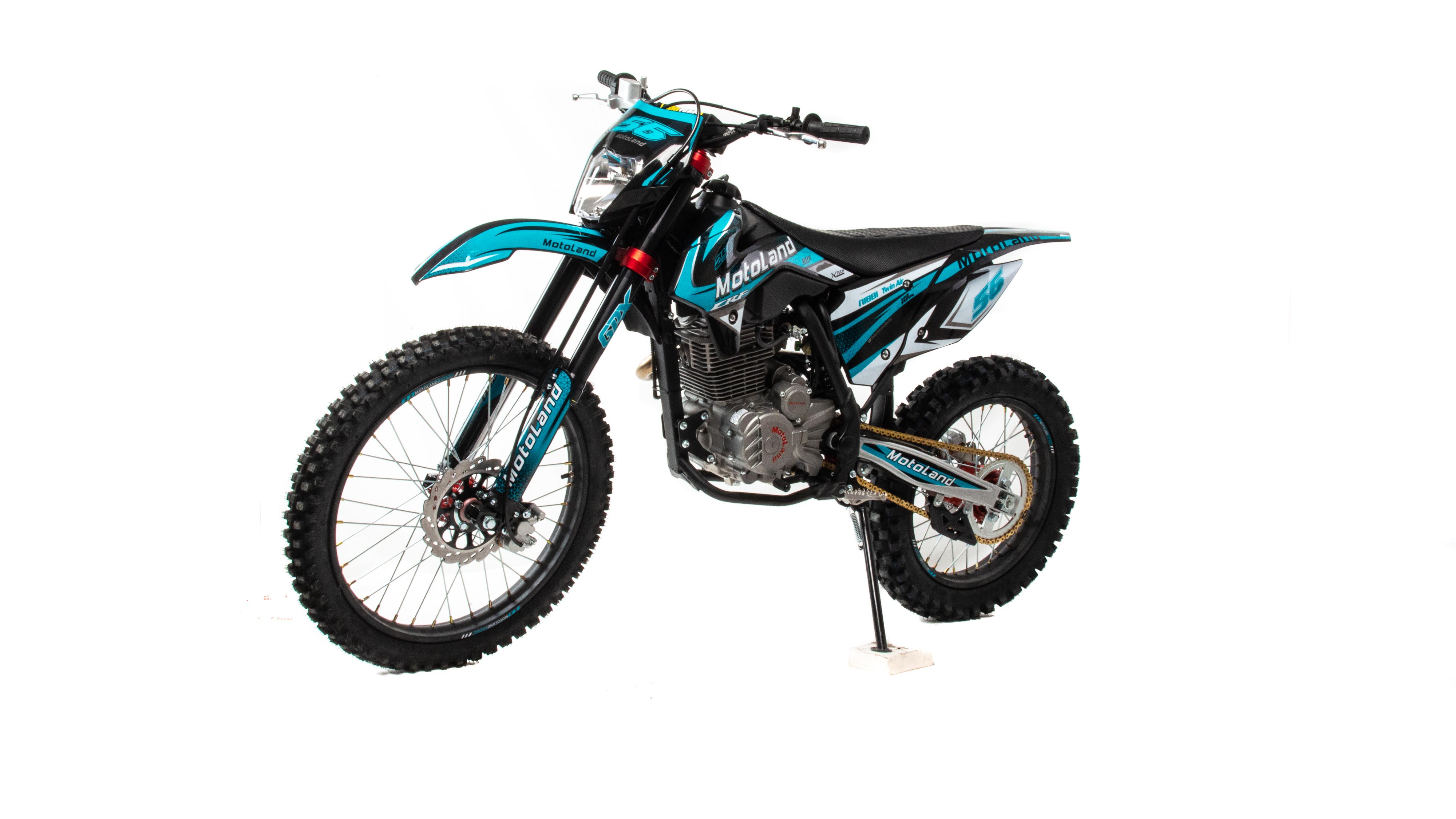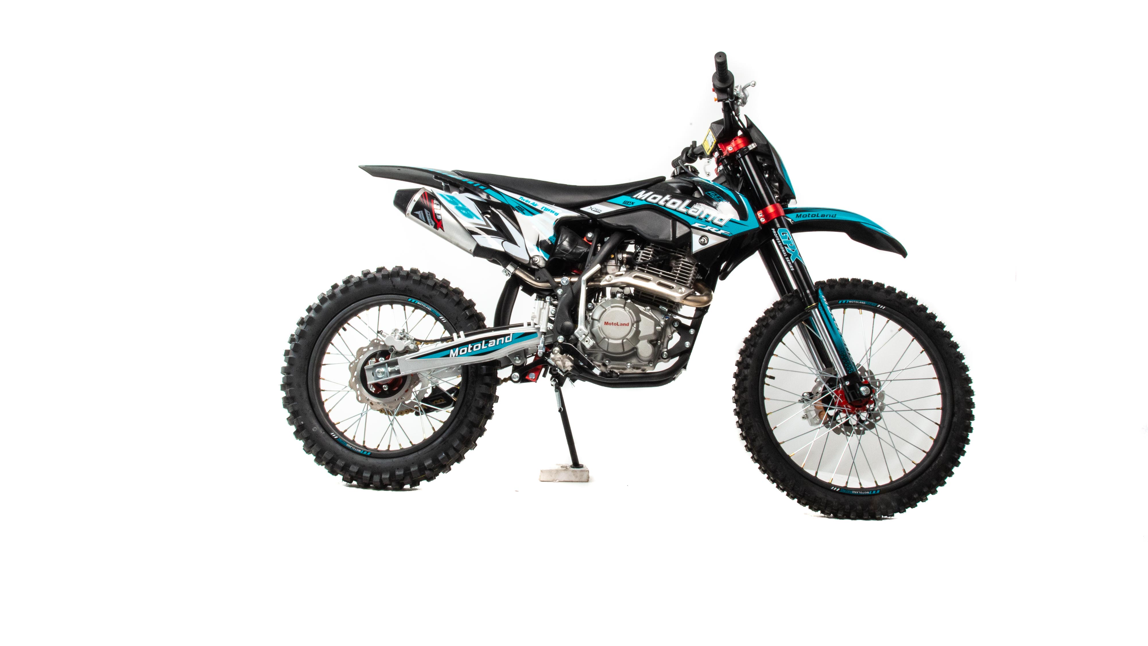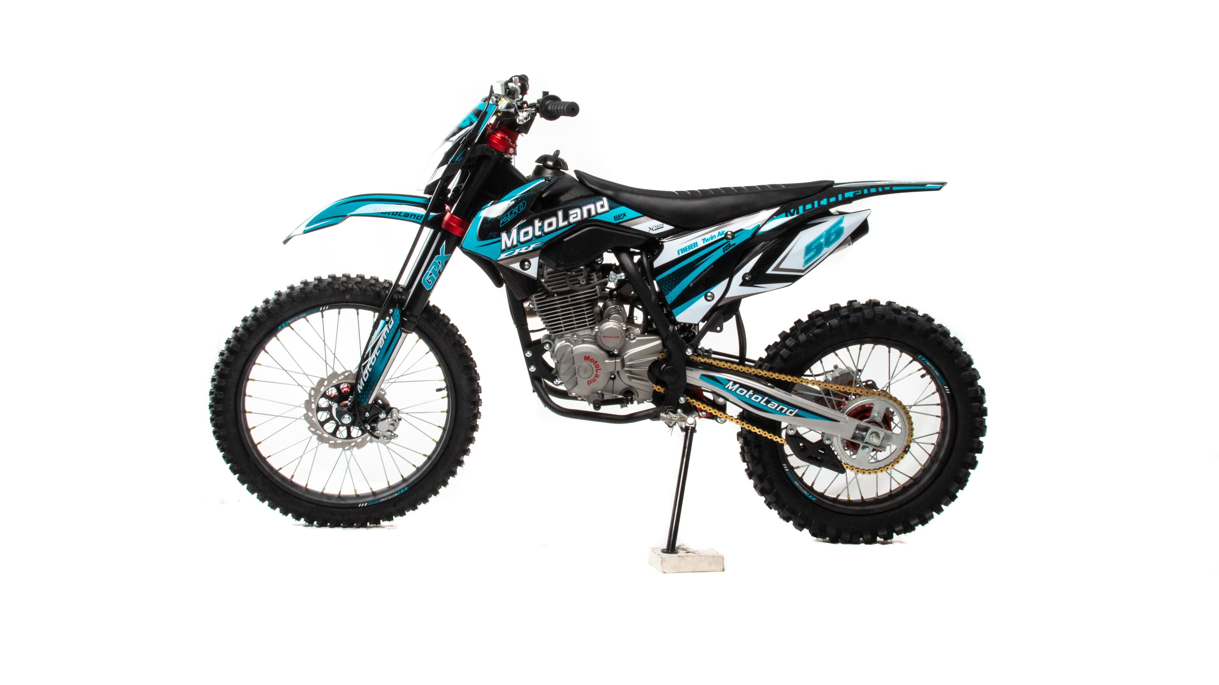 Объем двигателя 250 см3 и мощность 21 л. с. обеспечивает хорошую динамику разгона и высокую максимальную скорость. Коробка передач механическая, пятиступенчатая. Карбюратор NIBBI PE 30 оснащен резиновым патрубком, что обеспечивает снижение вибрации. Объём топливного бака 6 литров. Передняя подвеска — телескопическая, не регулируемая, перевёрнутого типа. Вилка GPX Professional оснащена клапанами, для стравливания избыточного давления, что позволяет значительно повысить ресурс работы сальников. Задняя подвеска с прогрессией, амортизатор имеет регулировку отбоя и преднатяг пружины. Рама мотоцикла полудуплексная, стальная. Сиденье кроссовое, с противоскользящим покрытием. Обода колес спецованные, стальные, черного цвета с алюминевыми, окрашенными литыми ступицами. Покрышки 80/100 "21 110/100 "18 с мощными грунтозацепами обеспечивают превосходное сцепление с грунтом и позволяют контролировать управляемость на нестабильных поверхностях кроссовых трасс. Размер заднеего колеса — 18 дюймов (450 мм), переднего — 21 дюйм (530 мм). Передние и задние тормоза дисковые, с надёжными двухпоршневыми суппортами. Руль GPX переменного сечения с алюминевыми литыми траверсами, выдерживает значительные нагрузки, в том числе при падениях. Высота по рулю и седлу позволяет чувствовать себя удобно как людям среднего, так и большого роста. Мотоцикл Motoland CRF 250 оснащён светодиодной фарой головного света. Система зажигания электронная (CDI). Запуск двигателя комбинированный ножным кикстартером и электростартером. Так же в комплекте есть щиток для номера, который ставится вместо фары при необходимости.