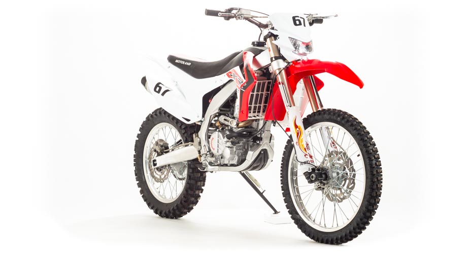 У модели Motoland XR 250 руль имеет переменное сечение: в месте установки его размер составляет 28 мм, а на концах под грипсами – 22 мм. Перевернутая вилка позволяет легче преодолевать любые неровности на дороге даже новичкам.