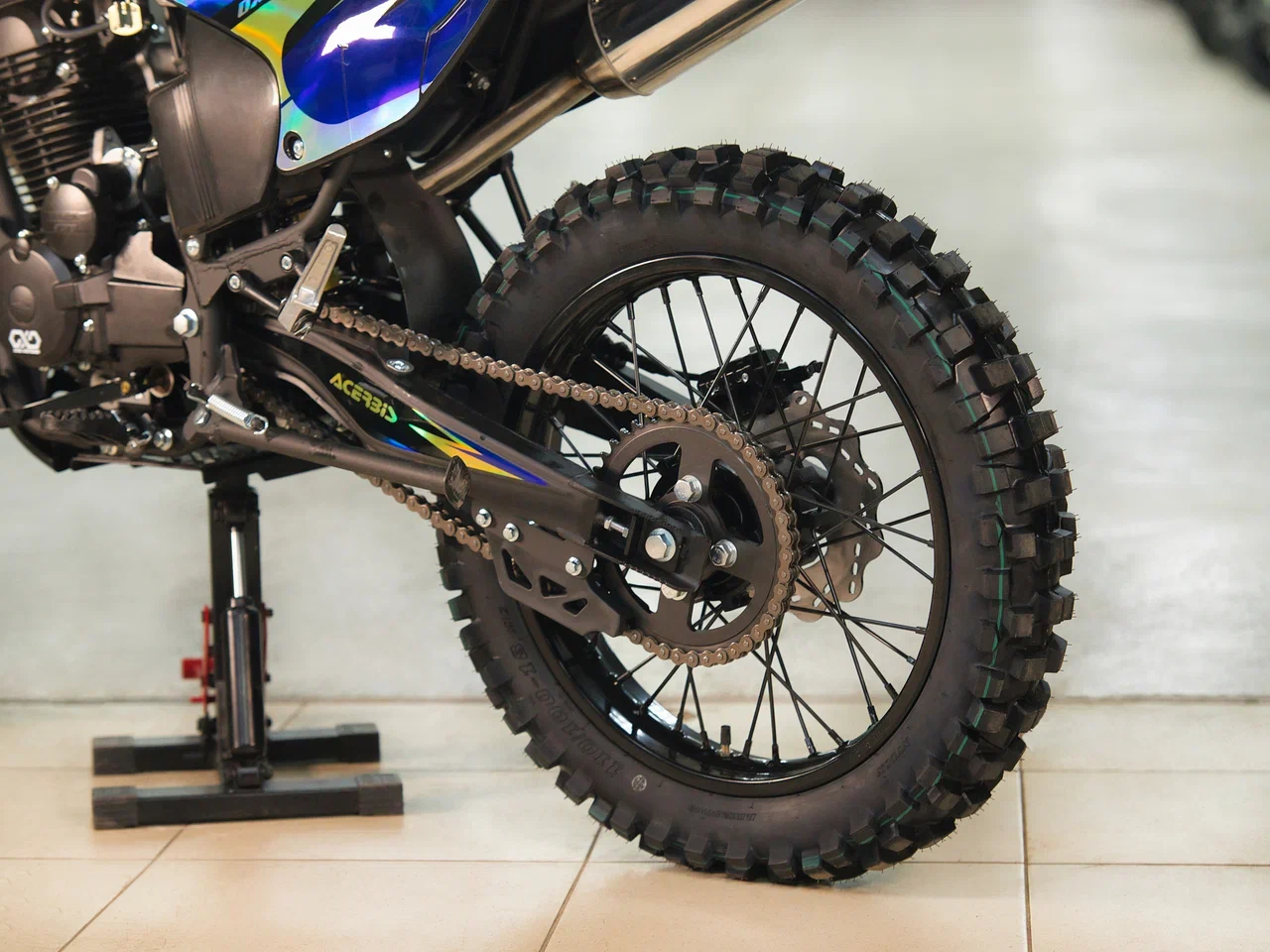 Размер передней покрышки: 80/100-21. Размер задней покрышки: 120/100-18. Они прекрасно себя ведут по песку и грязи, что позволяет райдеру отлично показать себя на пересеченной местности.