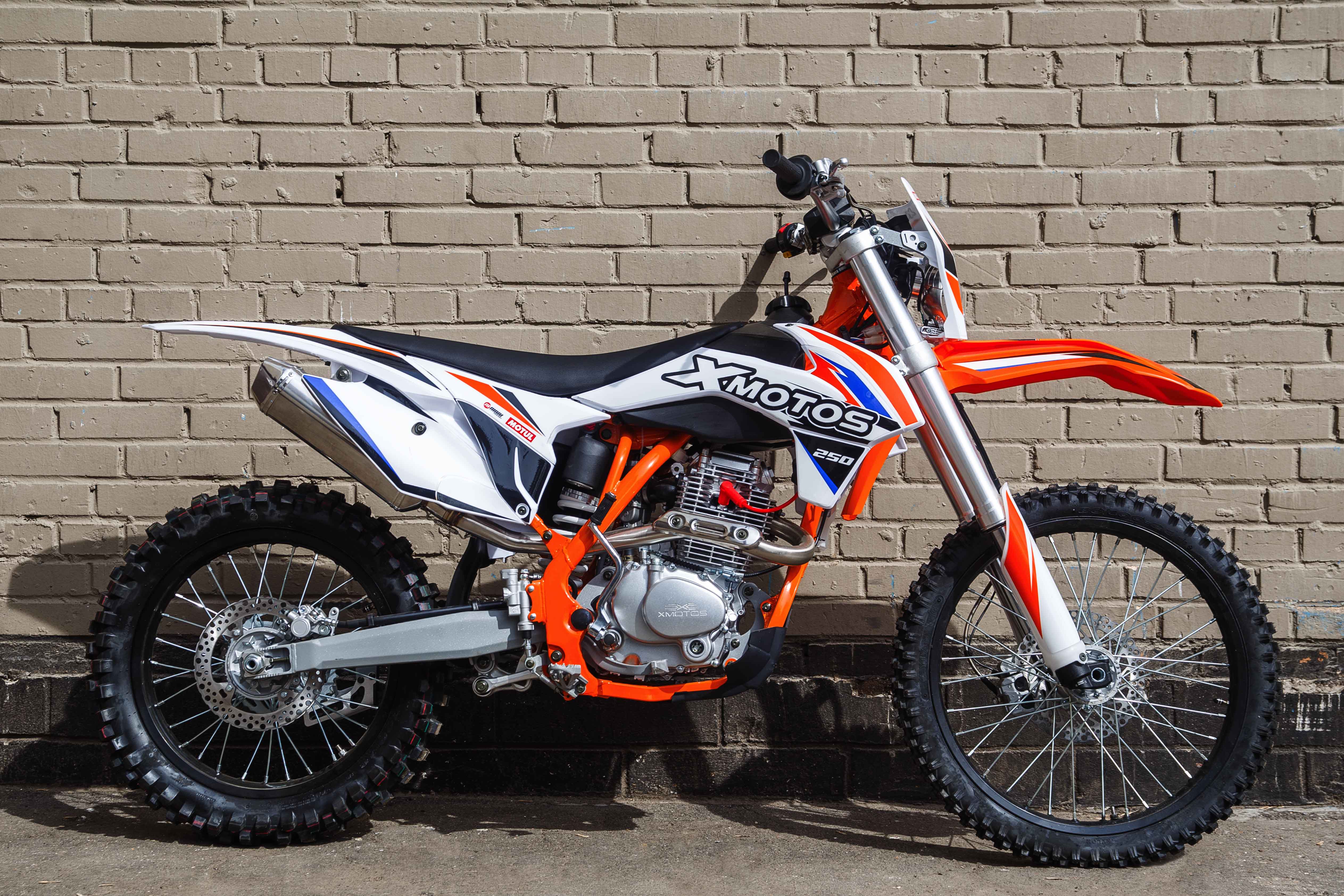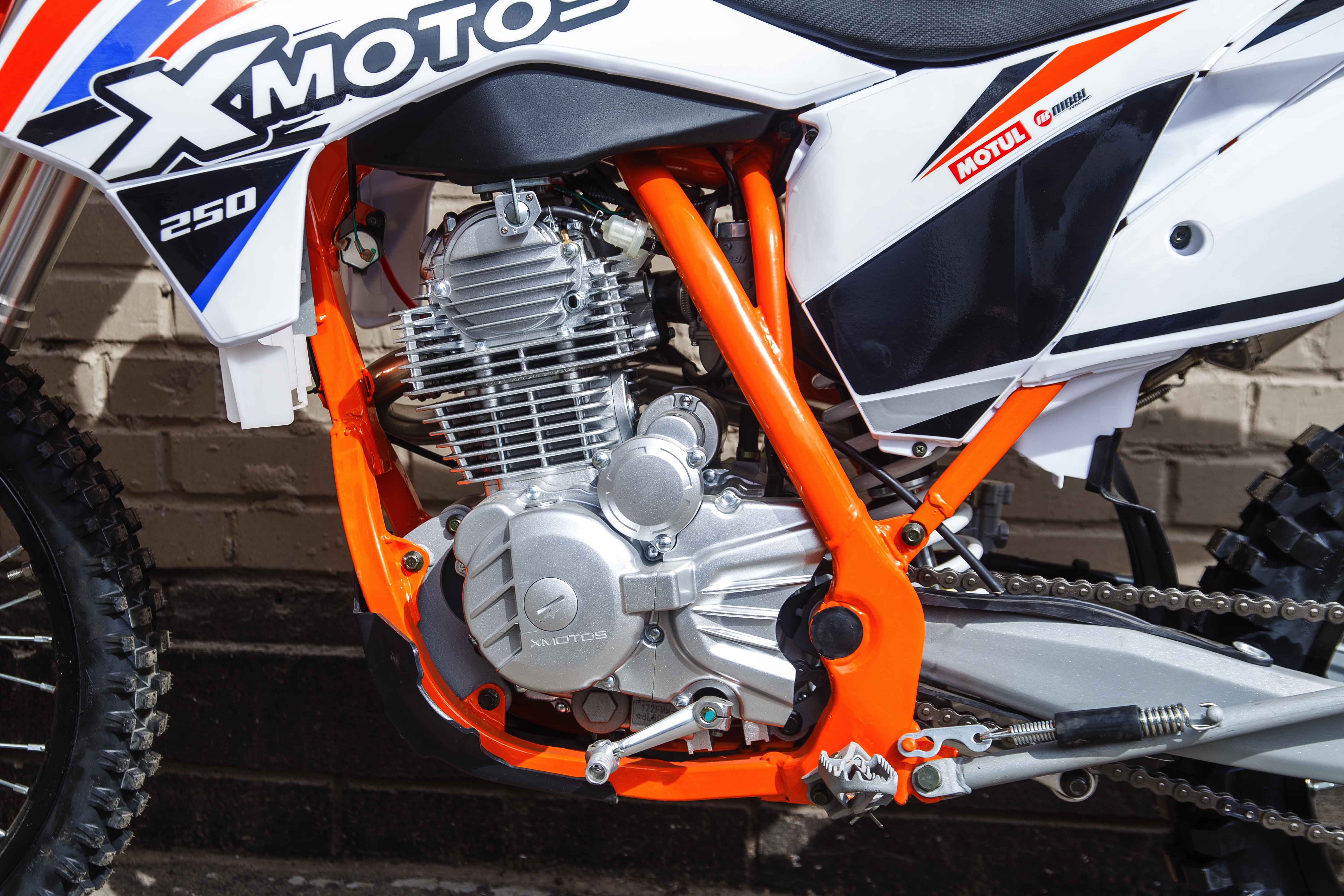 В раме XMOTOS Racer Pro установлен 4-тактный мотор Zongshen 172 FMM с воздушным охлаждением, который можно запускать как при помощи кнопки электростартера, так и привычным рычагом кик-стартера. Показатели максимальной мощности силовой установки мотоцикла составляют около 21 лошадиных сил. При этом ключевые комплектующие и производительность компонентов остаются на достаточно высоком уровне: гибкий, устойчивый к ударам пластик, алюминиевые(7116) ободья колес, фара головного света и нержавеющий выхлопной тракт и банка глушителя приятно дополняют четкую работу двигателя и трансмиссии.