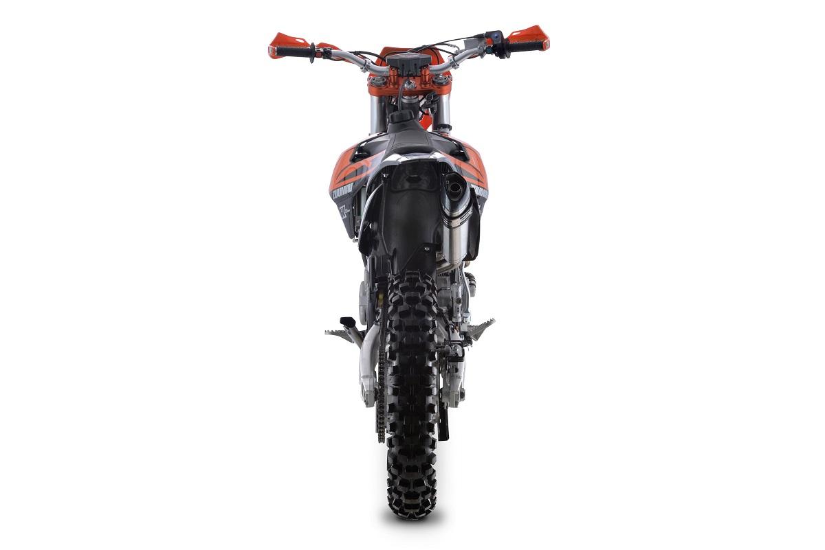 Мотоцикл имеет хром-молибденовую раму повышенной прочности и алюминиевый маятник, что обеспечивает прочность и долговечность конструкции. Подвеска представлена полностью регулируемой передней вилкой KKE диаметром 54*60 мм и задним амортизатором KKE с алюминиевой прогрессией, что позволяет адаптировать настройки под различные условия езды.