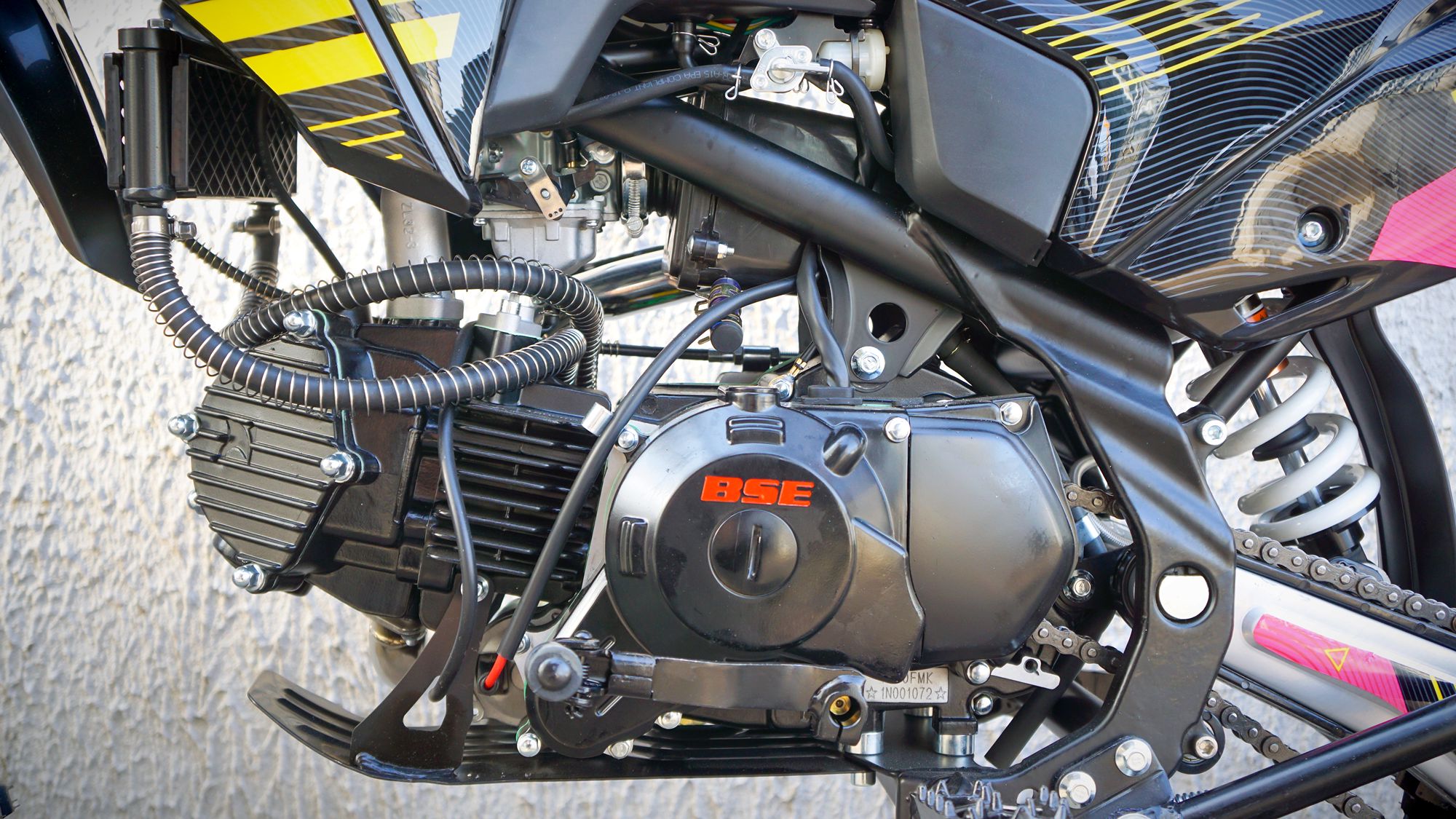 Питбайк BSE PH 150 19/16 AK47 Red (015). Основа PH150 - рама из хромомолибденовой стали повышенной жесткости с литыми усилителями - фирменный знак качества завода BOSUER! Cиловая установка питбайка - надежный и тяговитый 4-тактным двигателем YX объёмом 150 см3 с воздушным охлаждением. Максимальная мощность – внушительные 15 лс. Питает мотор карбюратор MIKUNI VM22. Питбайк оснащен 4-ступенчатой механической трансмиссией. Запуск мотора осуществляется при помощи электростартера или кик-стартера. Подвески с большими ходами: передняя - телескопическая вилка перевёрнуто типа, задняя- моноамортизатор.