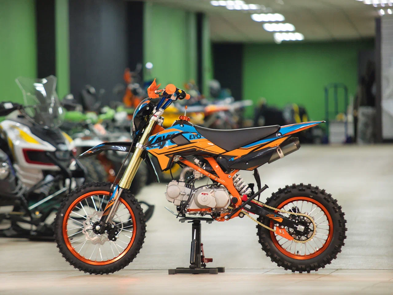 Питбайк KAYO Evolution K125EM KRZ – идеальный снаряд для наработки первого опыта в мотокроссе и эндуро, который можно использовать на лёгких кроссовых трассах и дорогах с различным покрытием. Удобный, простой и надёжный мотоцикл, который полностью оправдывает свою цену.