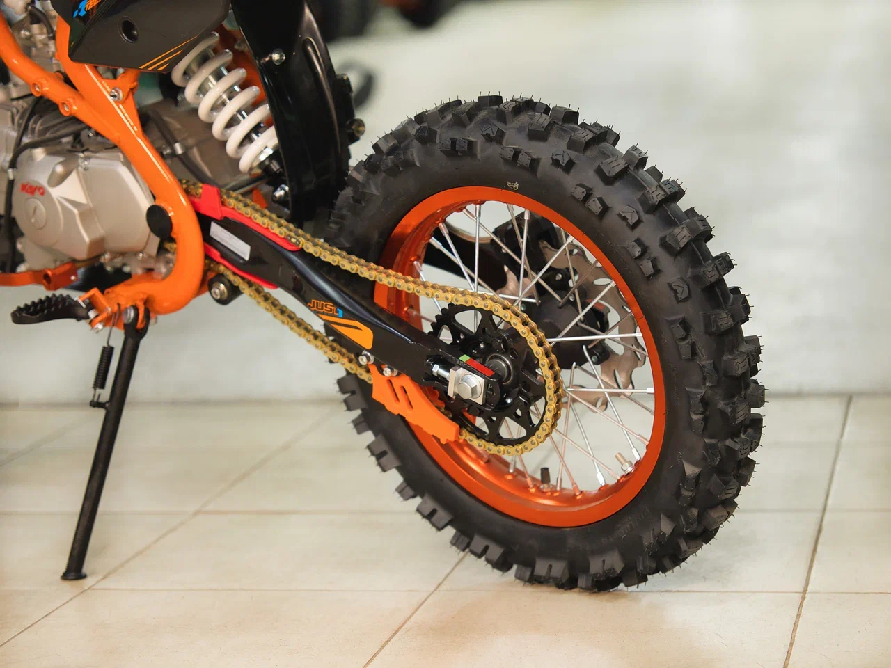 Высококачественная износостойкая резина с развитым протектором отлично держит дорогу на различных типах покрытия. Байк оснащён как системой запуска двигателя при помощи кнопки электростартера, так и рычагом кик-стартера. Питбайк имеет вместительный топливный бак на 5,7 л, что гораздо больше, нежели у других байков этого класса.