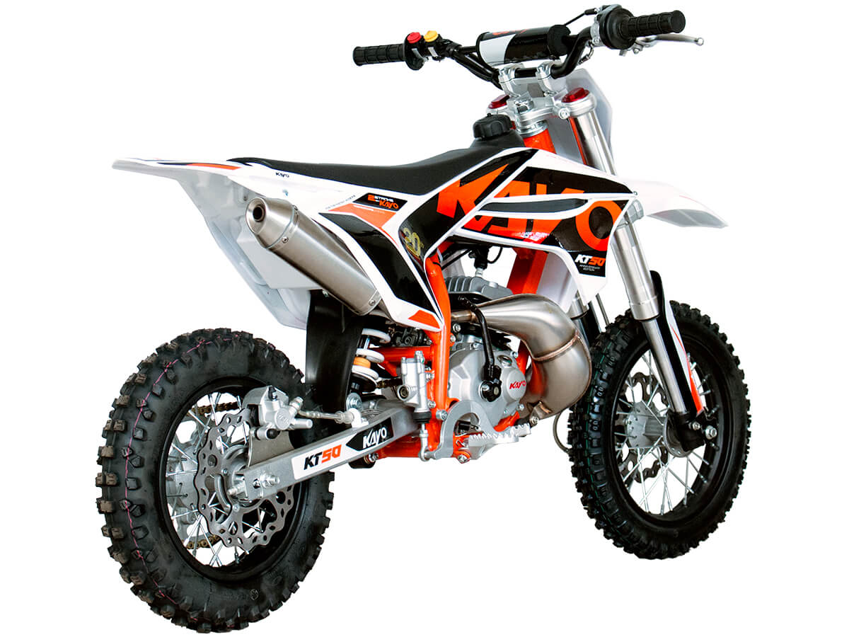 Одноцилиндровый 2-тактный двигатель воздушного охлаждения объёмом 50 см3, выдаёт очень неплохую мощность в 8,9 л.с. Карбюратор PZ обеспечивает бесперебойную работу техники в самых жёстких условиях эксплуатации, простоту и лёгкость в обслуживании, а также неприхотливость к качеству топлива. KT50L оснащён автоматической коробкой передач, что позволит райдерам полностью сосредоточиться на управлении питбайком.