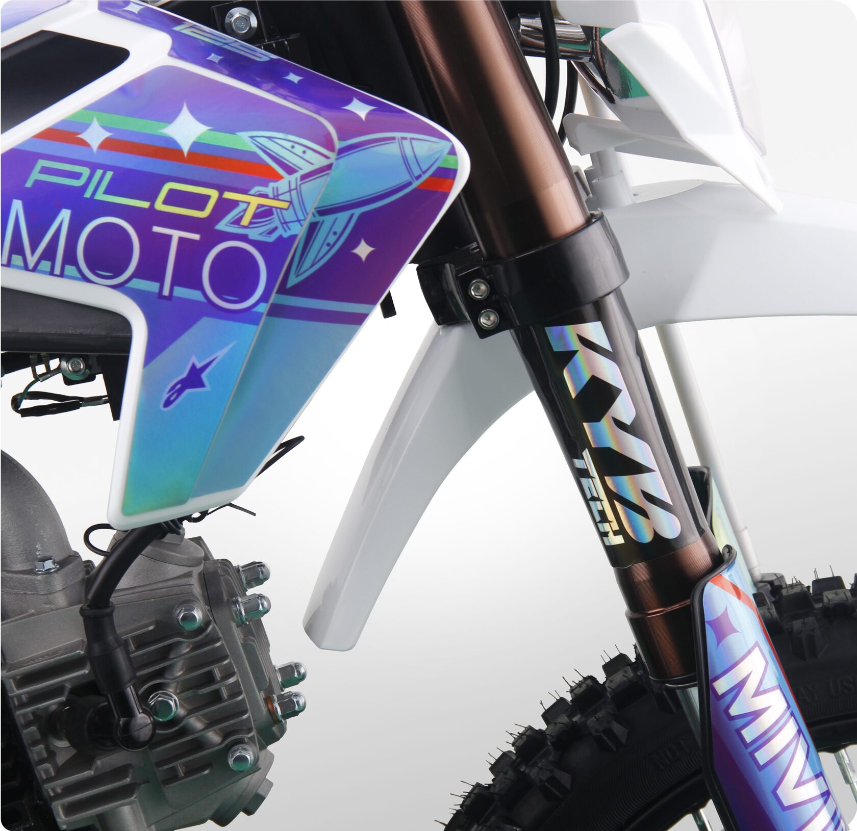 - Спереди питбайк оснащен перевернутой телескопической вилкой KYB tech, сзади — моноамортизатором с регулируемой жесткостью. Конфигурация обеспечивает плавный ход, хорошую отработку неровностей и комфорт при прыжках и резких маневрах.