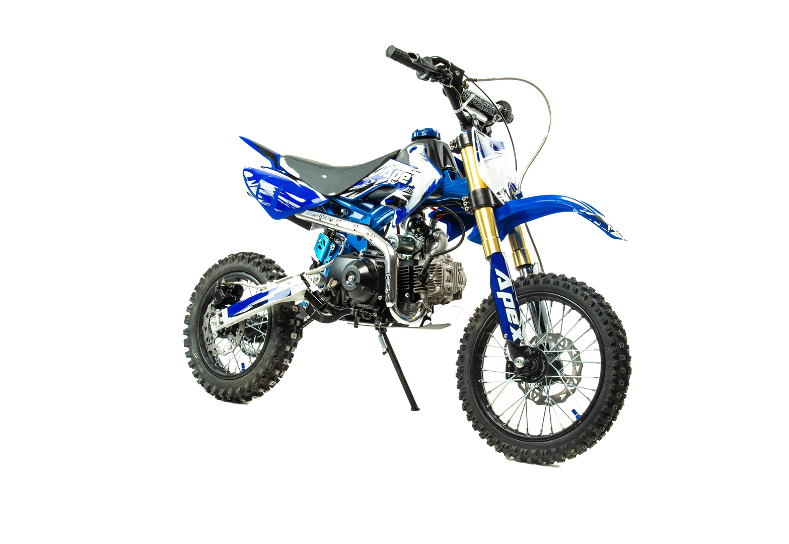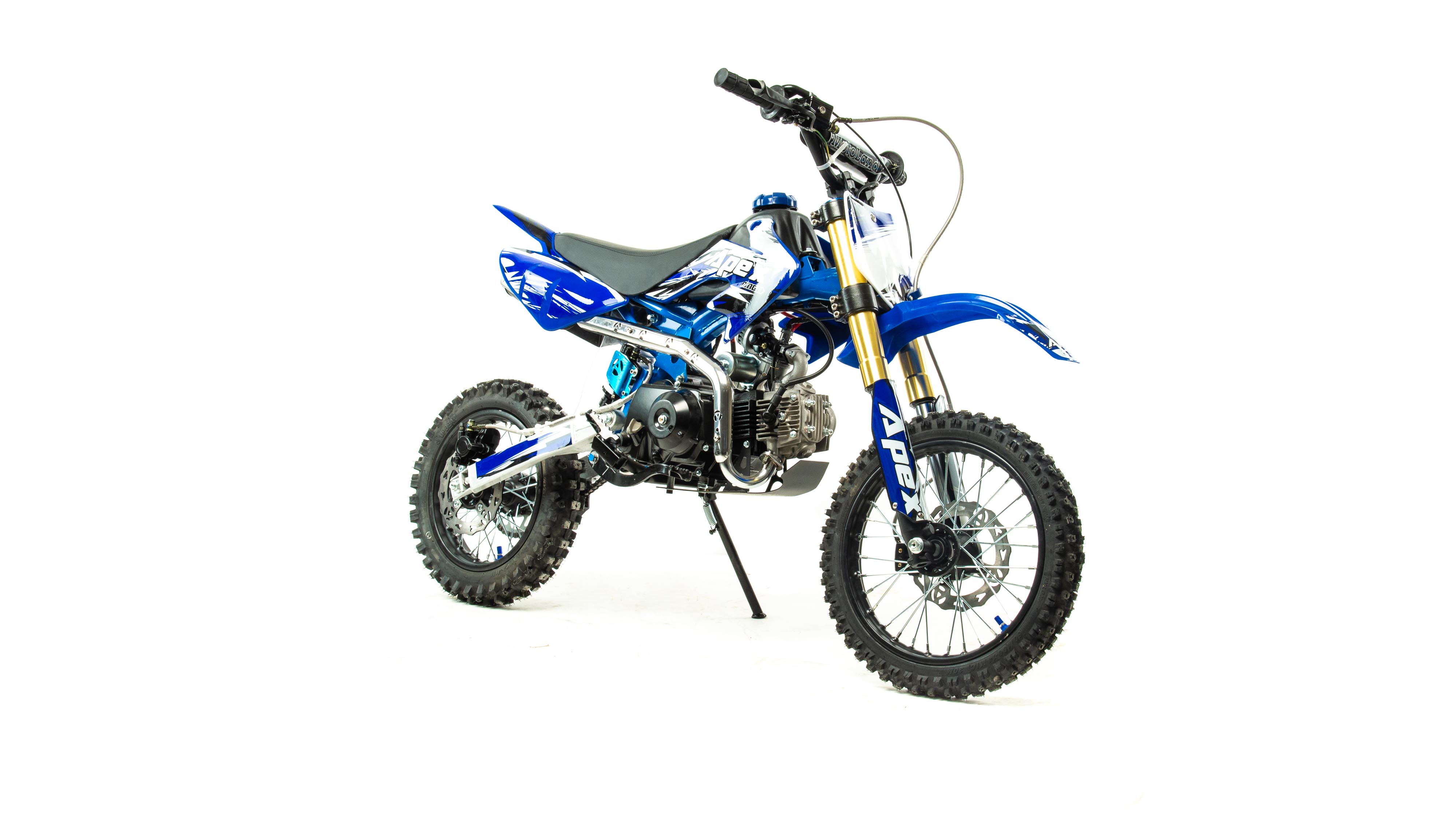 едорогой надёжный питбайк APEX10 идеален для поездок по грунтовым дорогам и бездорожью для детей которые уже научились ездить на маленьких мотоциклах объемом 50 куб.см. Хорошо чувствует себя на мягком и среднем грунте, разгоняется до 70 км/ч. Оснащён CNC траверсами, фарой, алюминиевыми ободами, весит всего 65 кг. Питбайк прост в управлении и не требует специального ухода.